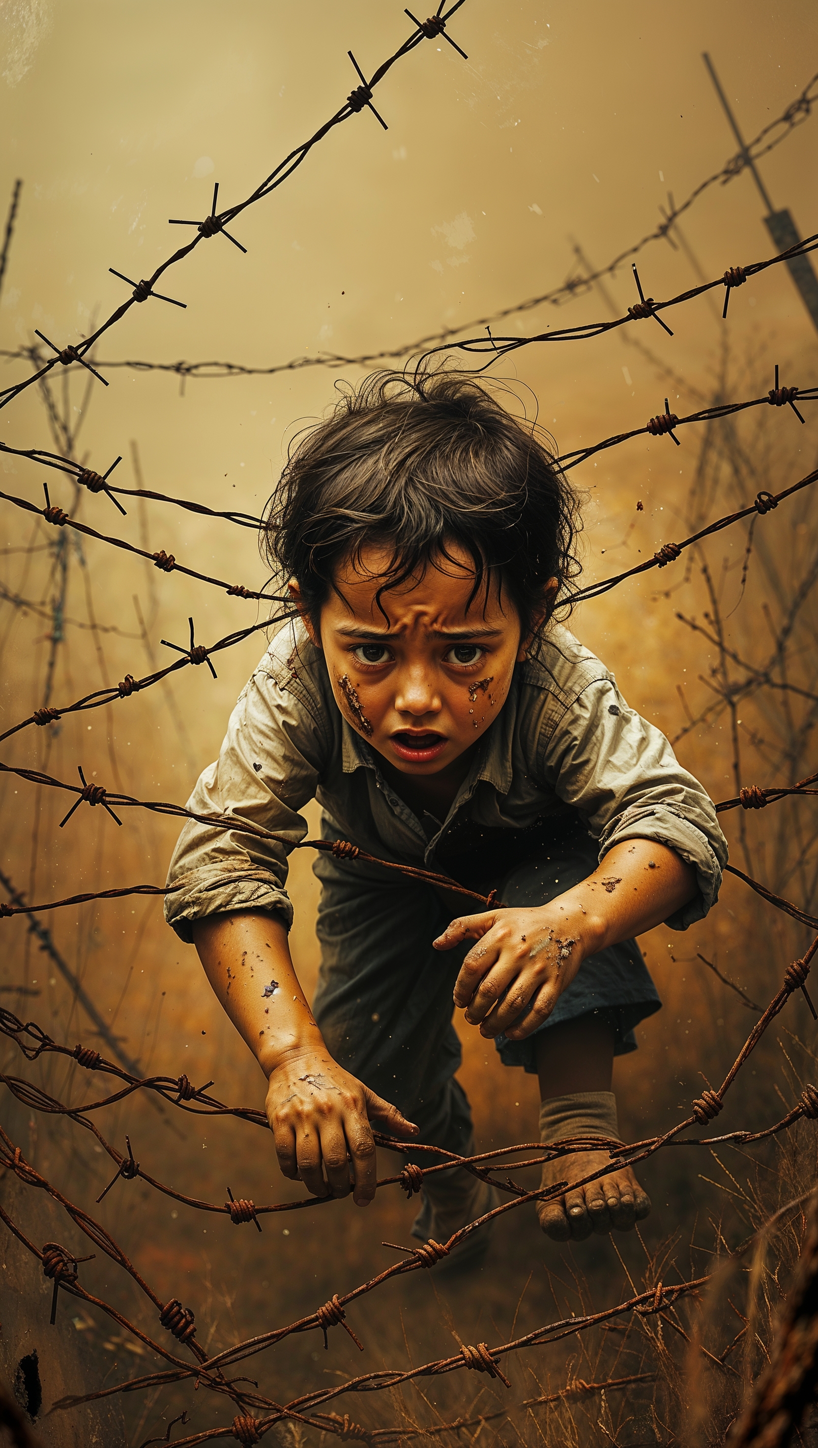 1664x2944 A painting of a child escaping through barbed wire, Banksy-style