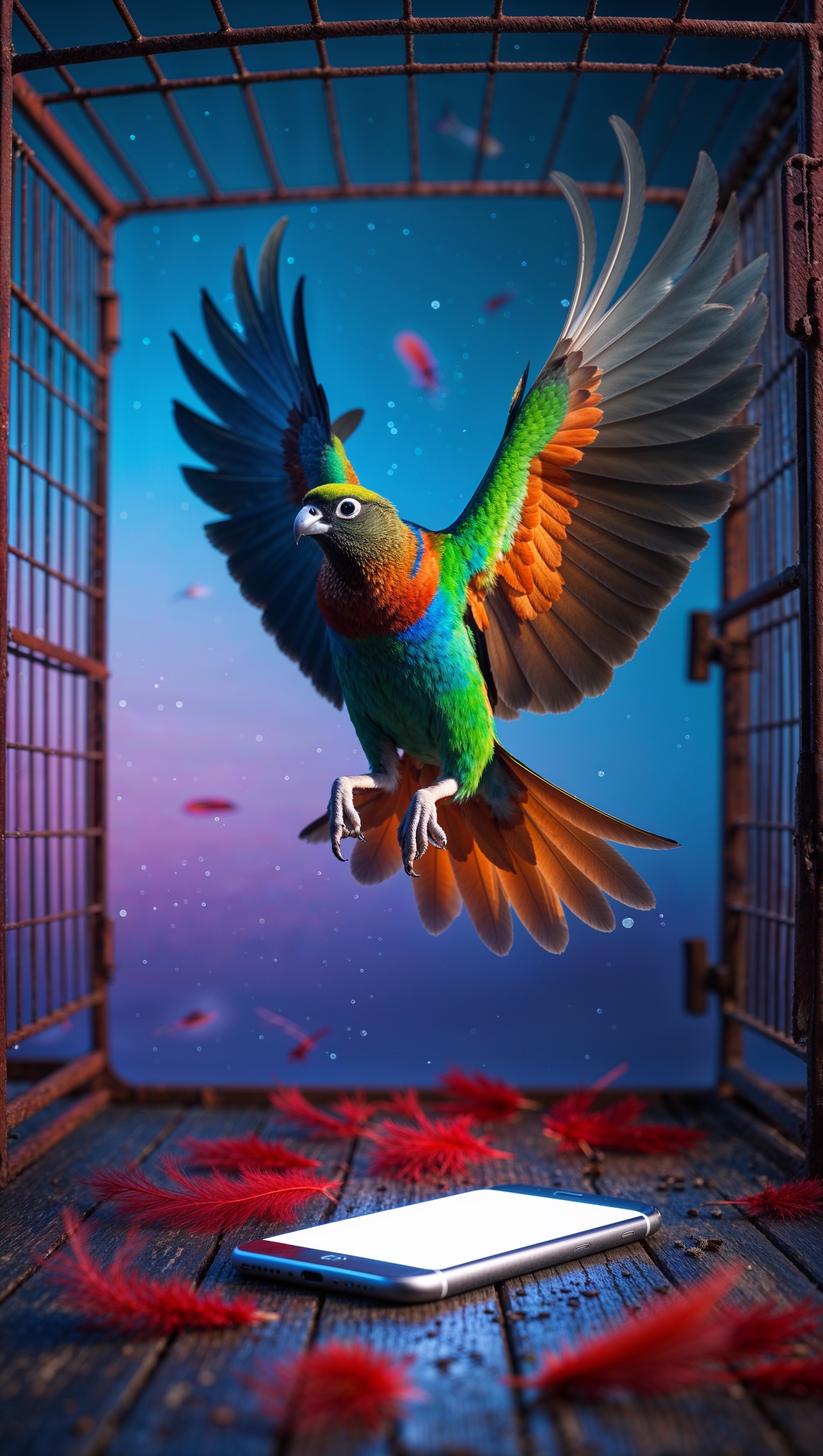 1664x2944 An image of a bird opening its cage, leaving an iPhone inside