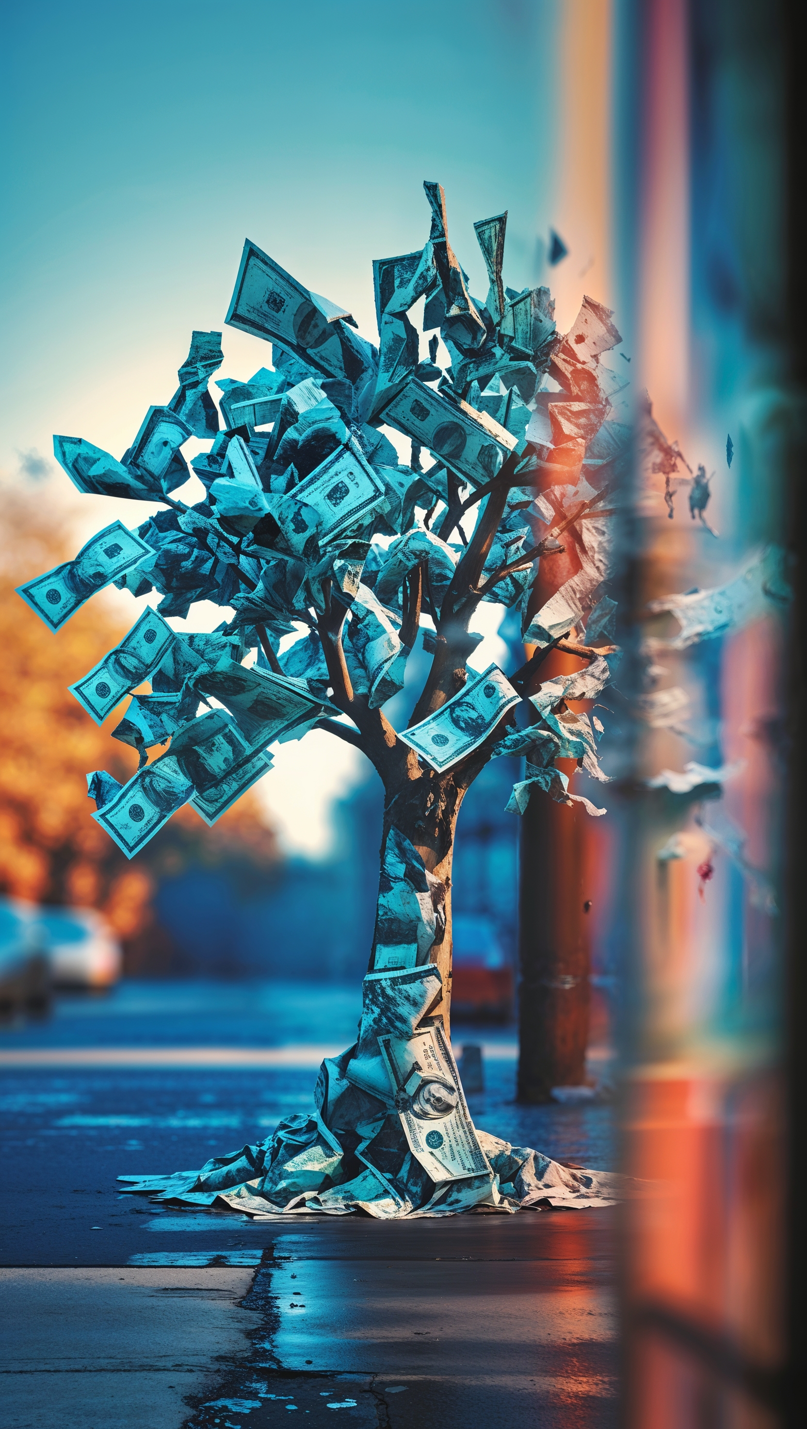 1664x2944 Street painting of a tree with money as leaves, inspired by Banksy