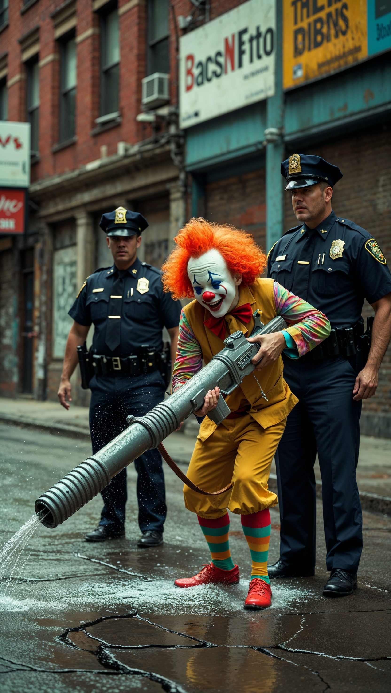 1664x2944 An image of a clown soaking police officers with a water gun, Banksy style