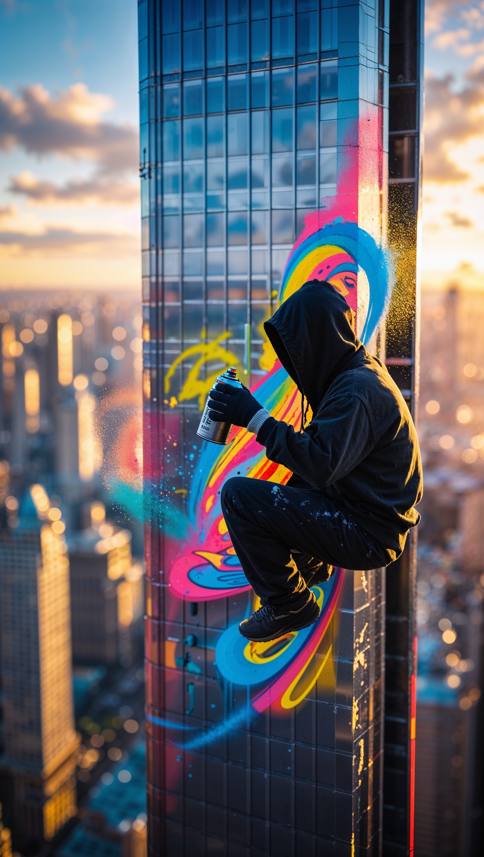 1664x2944 A design of a street artist painting on a skyscraper, inspired by Banksy