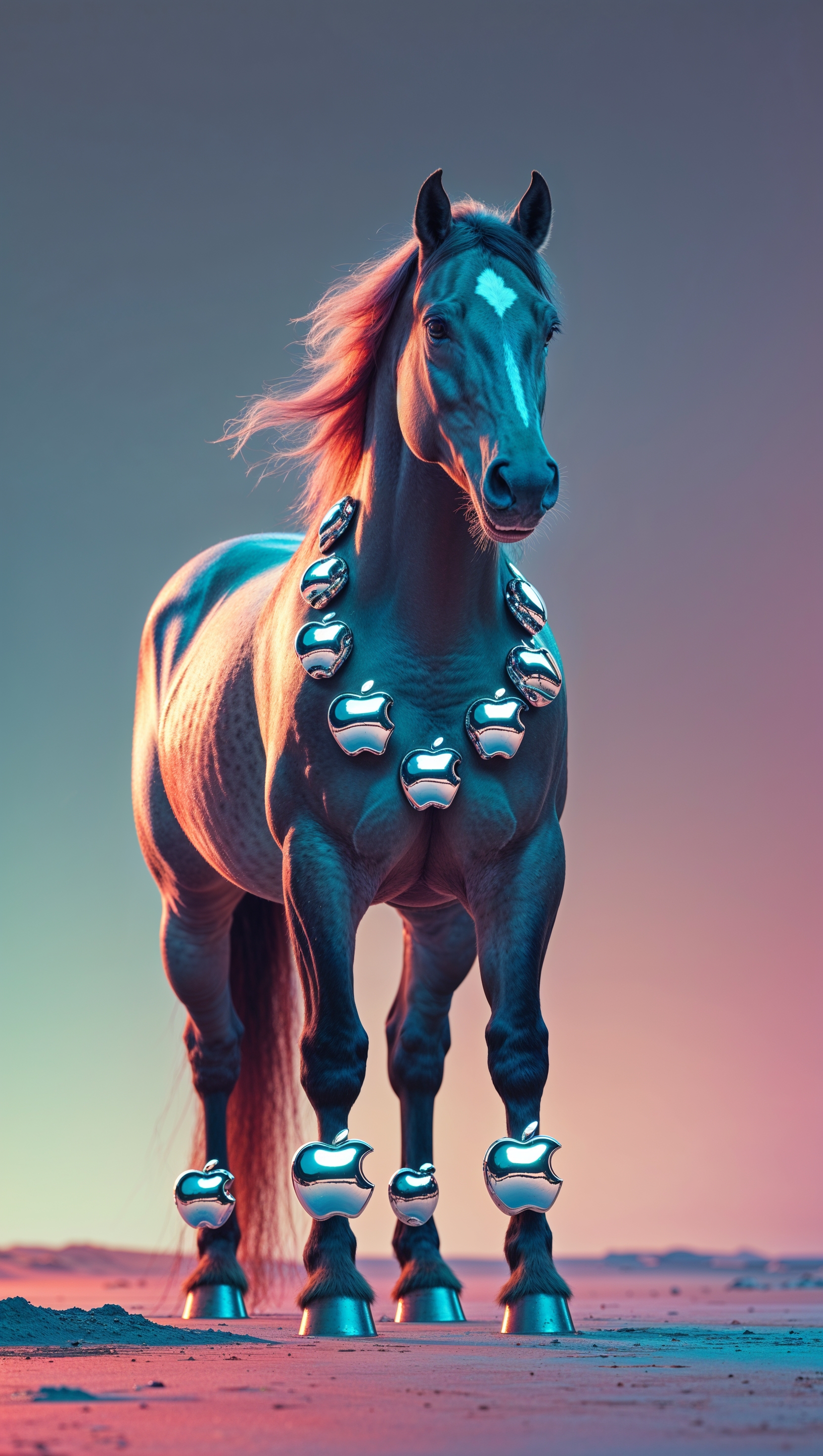 1664x2944 A painting of a horse with Apple logos instead of horseshoes