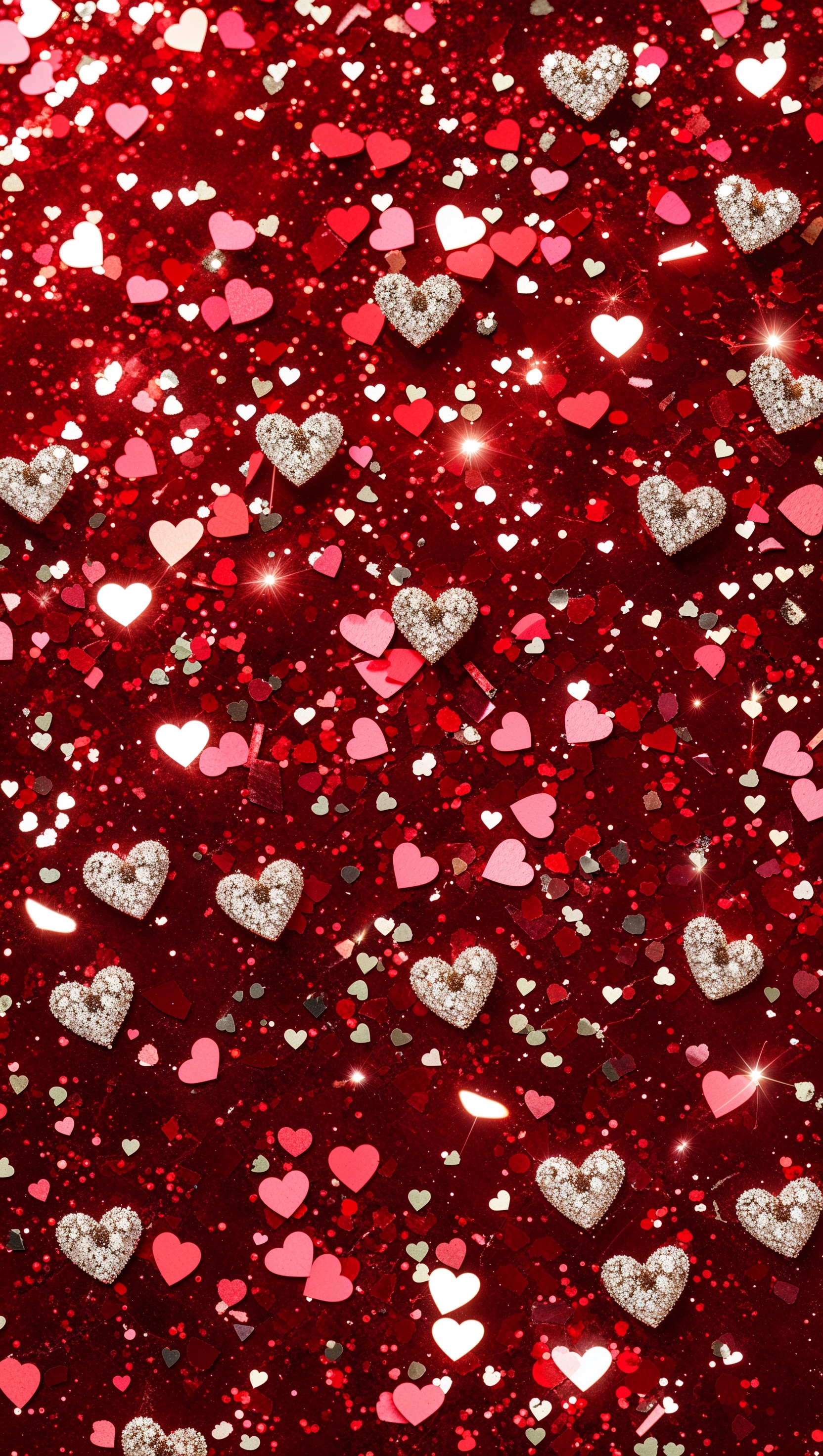 1664x2944 Red glitter background with heart-shaped sparkles, romantic and vibrant