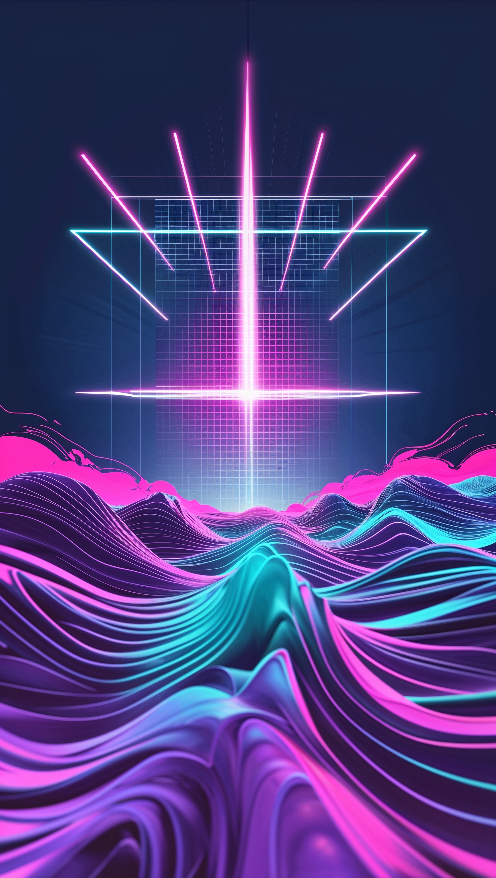 1664x2944 Retro-futuristic abstract design with glowing grid and geometric waves