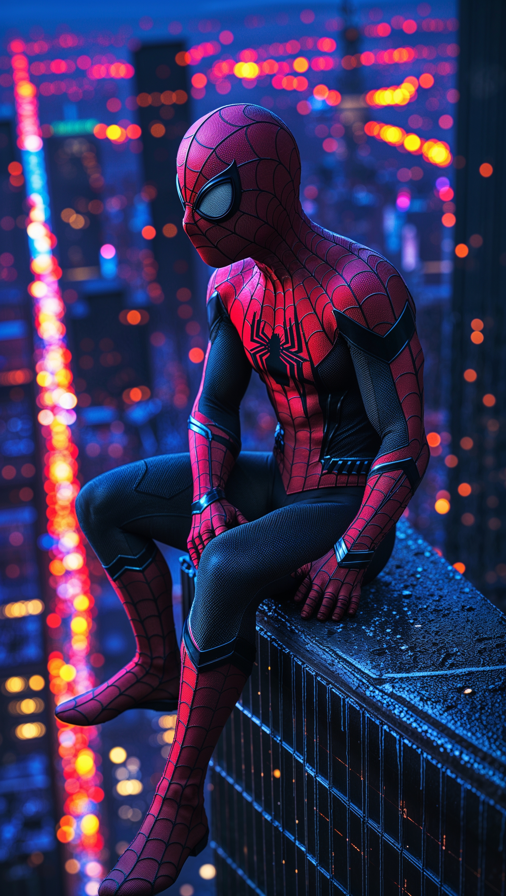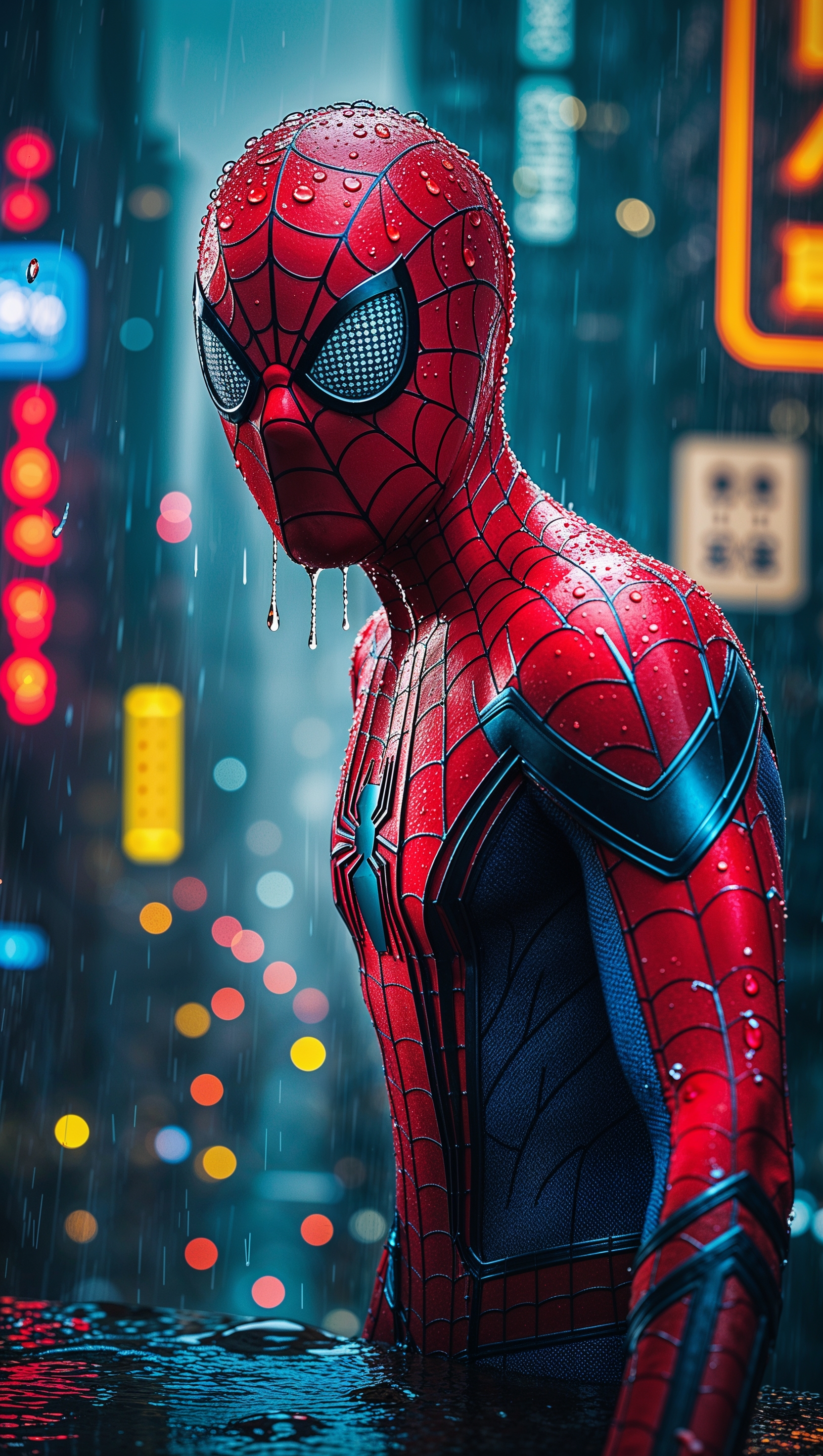 1664x2944 Spider-Man in the rain with a dark background and city lights