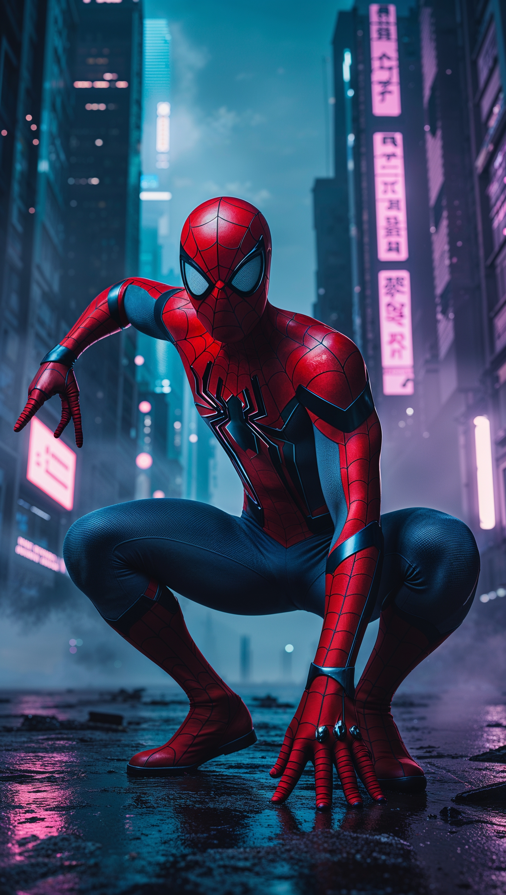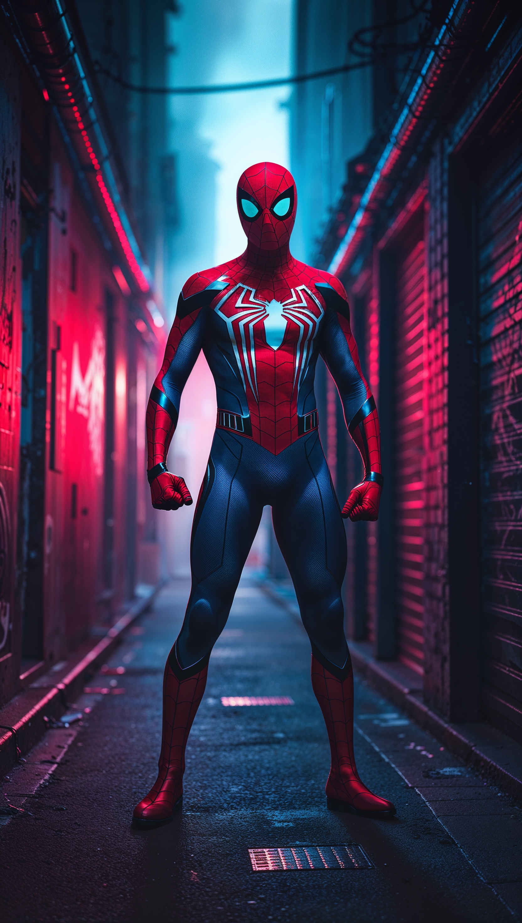 1664x2944 Spider-Man in a dark alley with red and blue neon lights