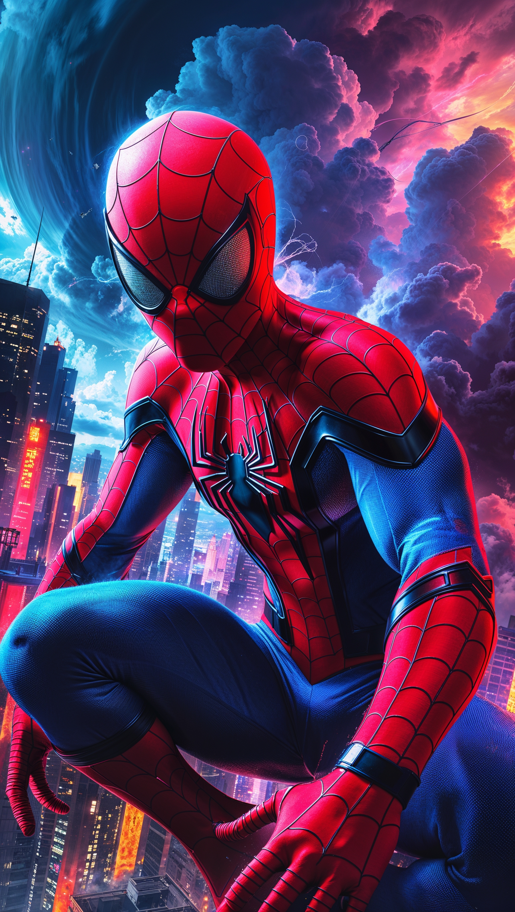 1664x2944 Spider-Man at night with neon lights and a skyline of tall towers