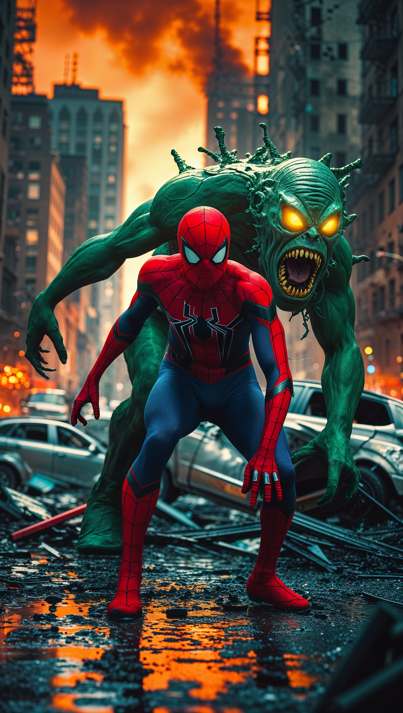 1664x2944 Spider-Man fighting a giant monster in the ruins of a city