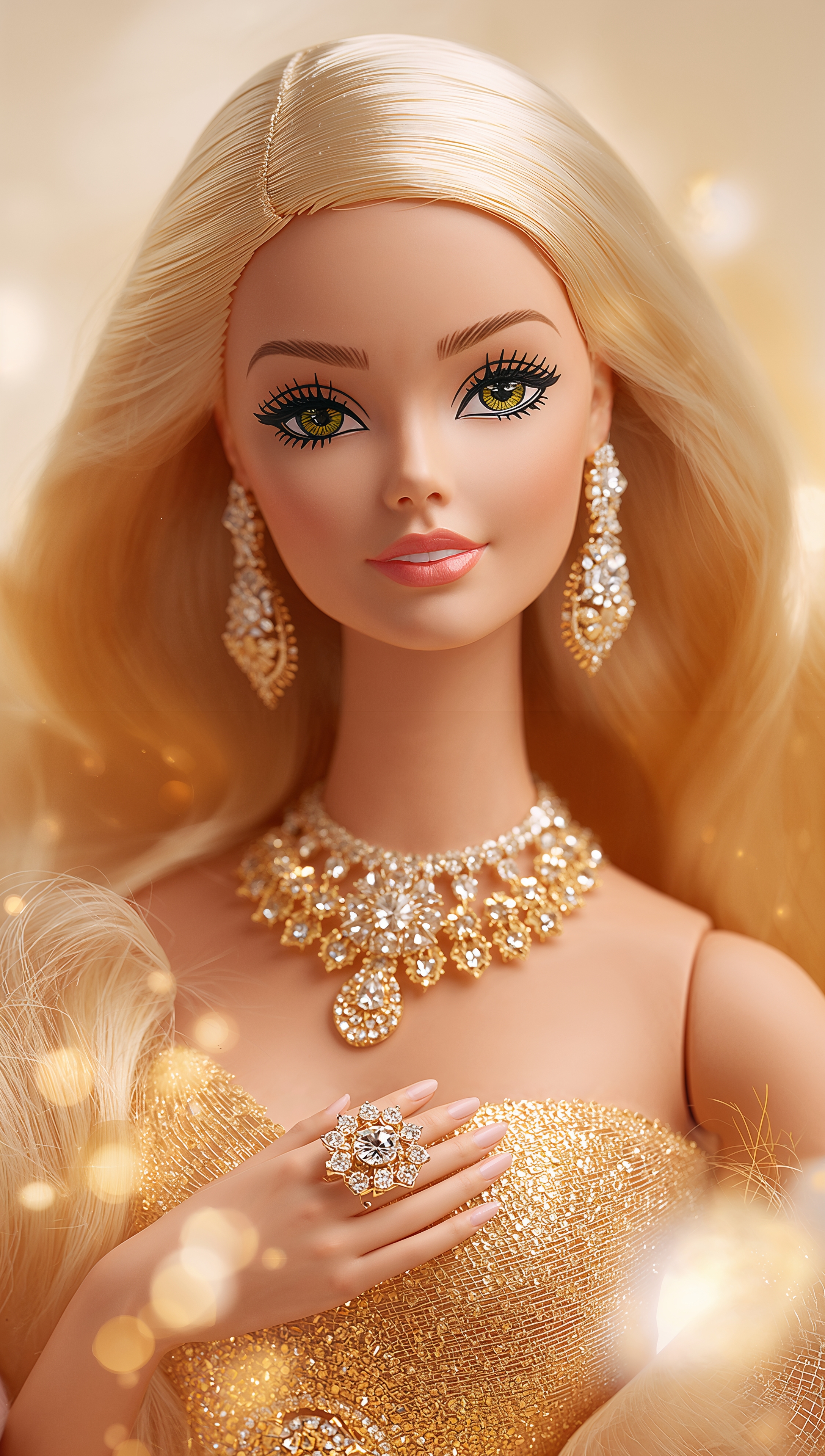 Barbie with luxury jewelry, golden sparkle, 4K 2176x3840 Barbie with luxury jewelry, golden sparkle, 4K