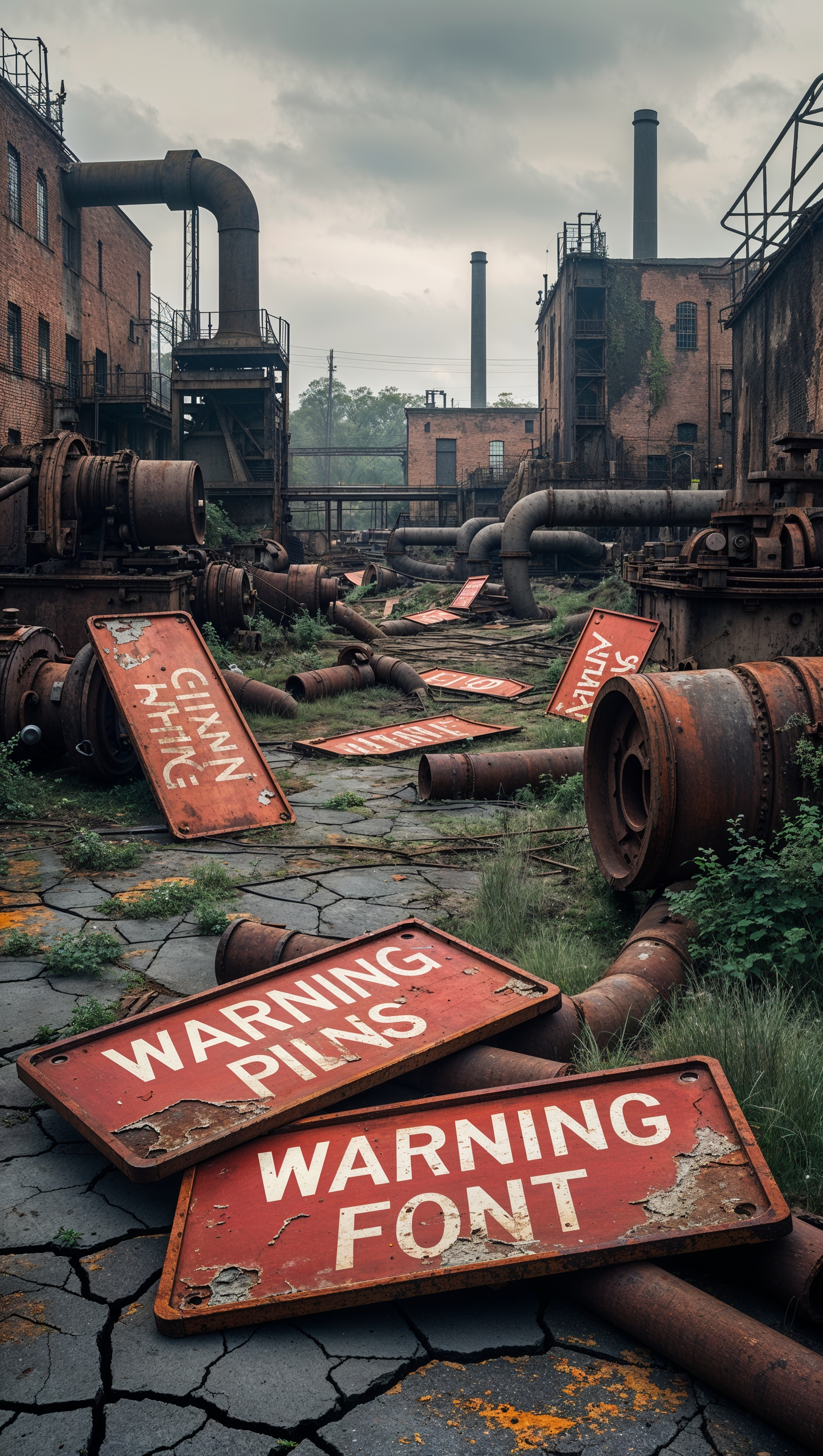 1664x2944 Red warning signs scattered through an abandoned industrial zone