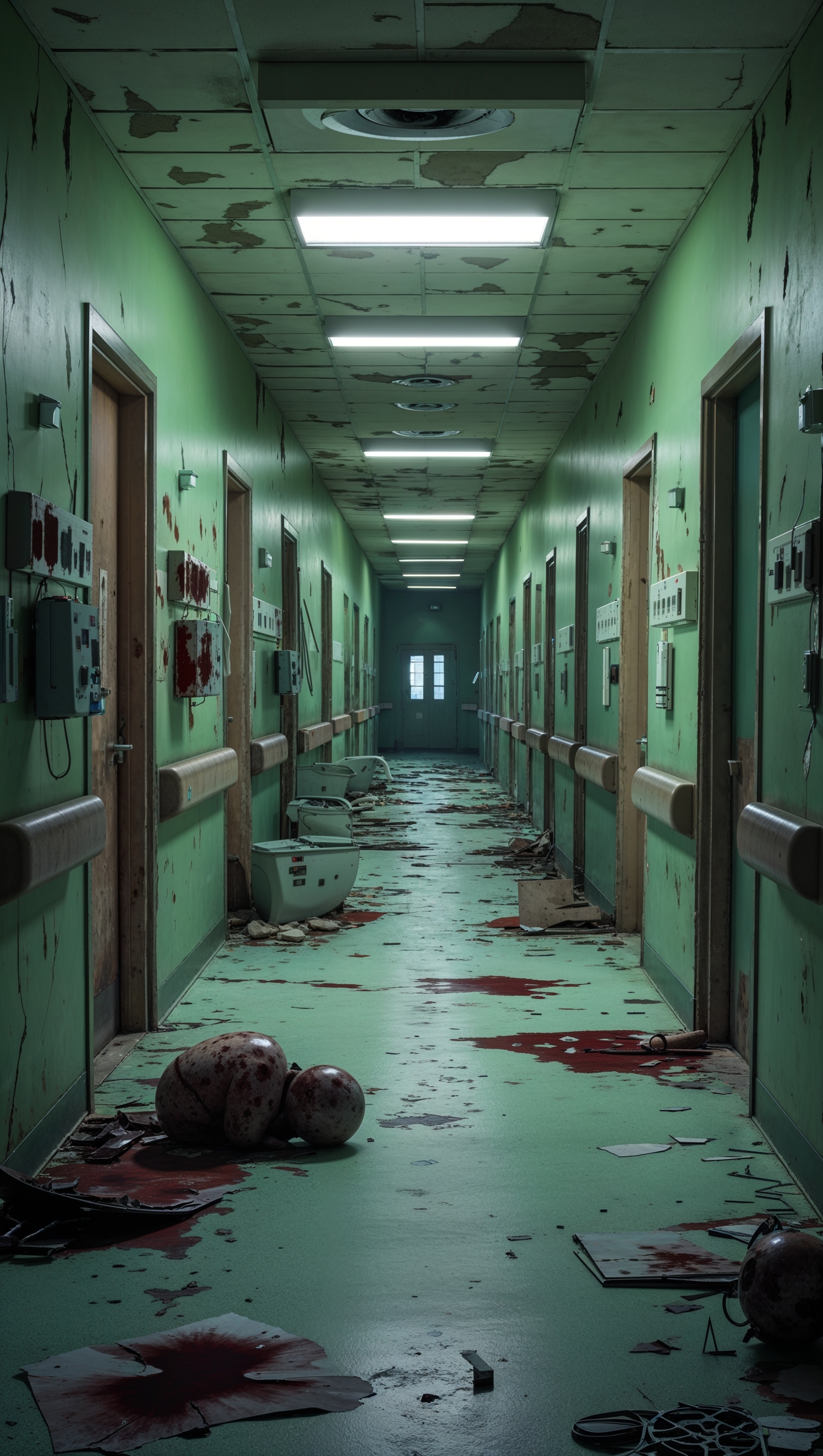 1664x2944 Abandoned hospital hallway, flickering lights and blood stains