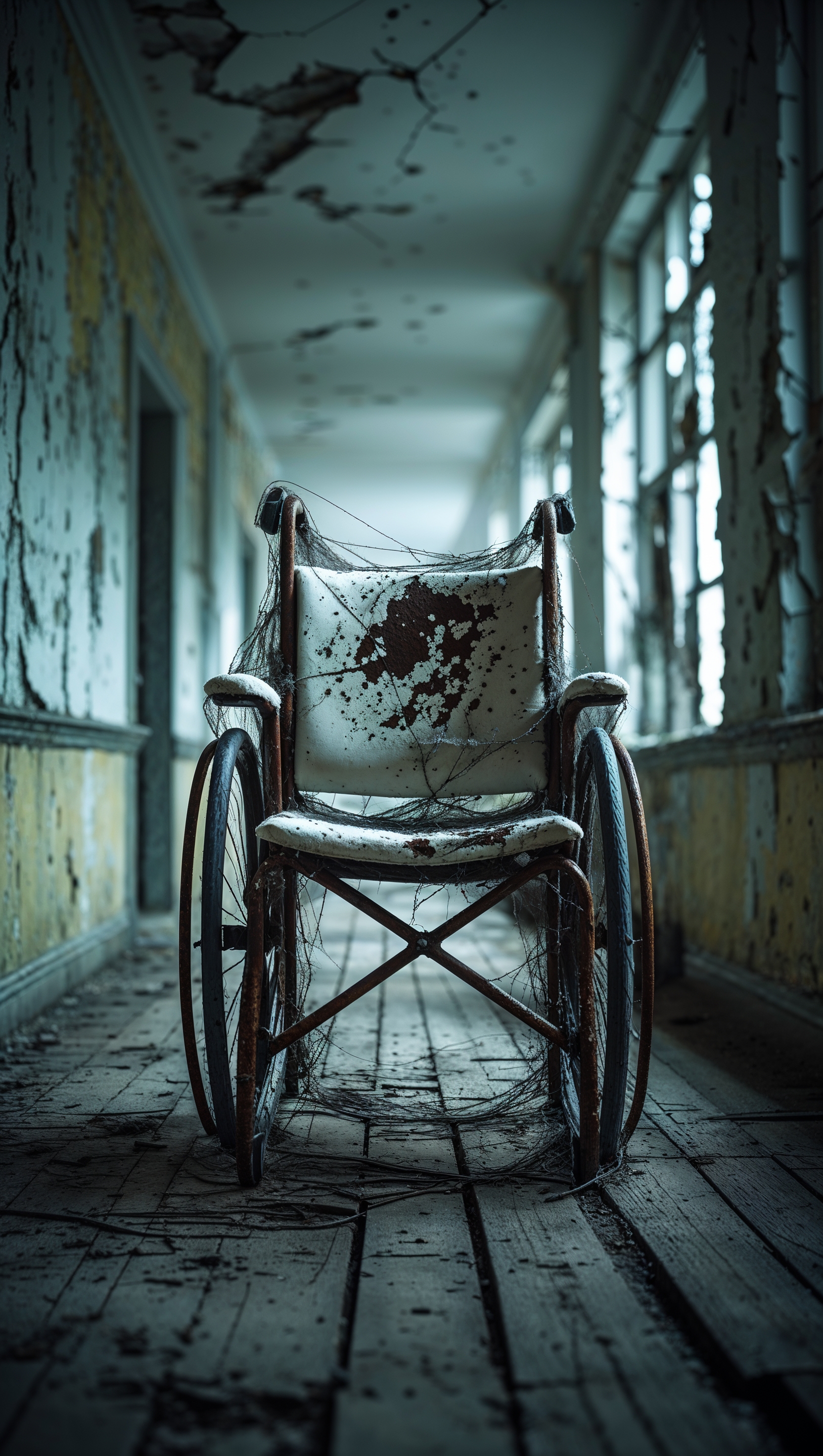 1664x2944 Creepy wheelchair in the middle of an abandoned asylum corridor