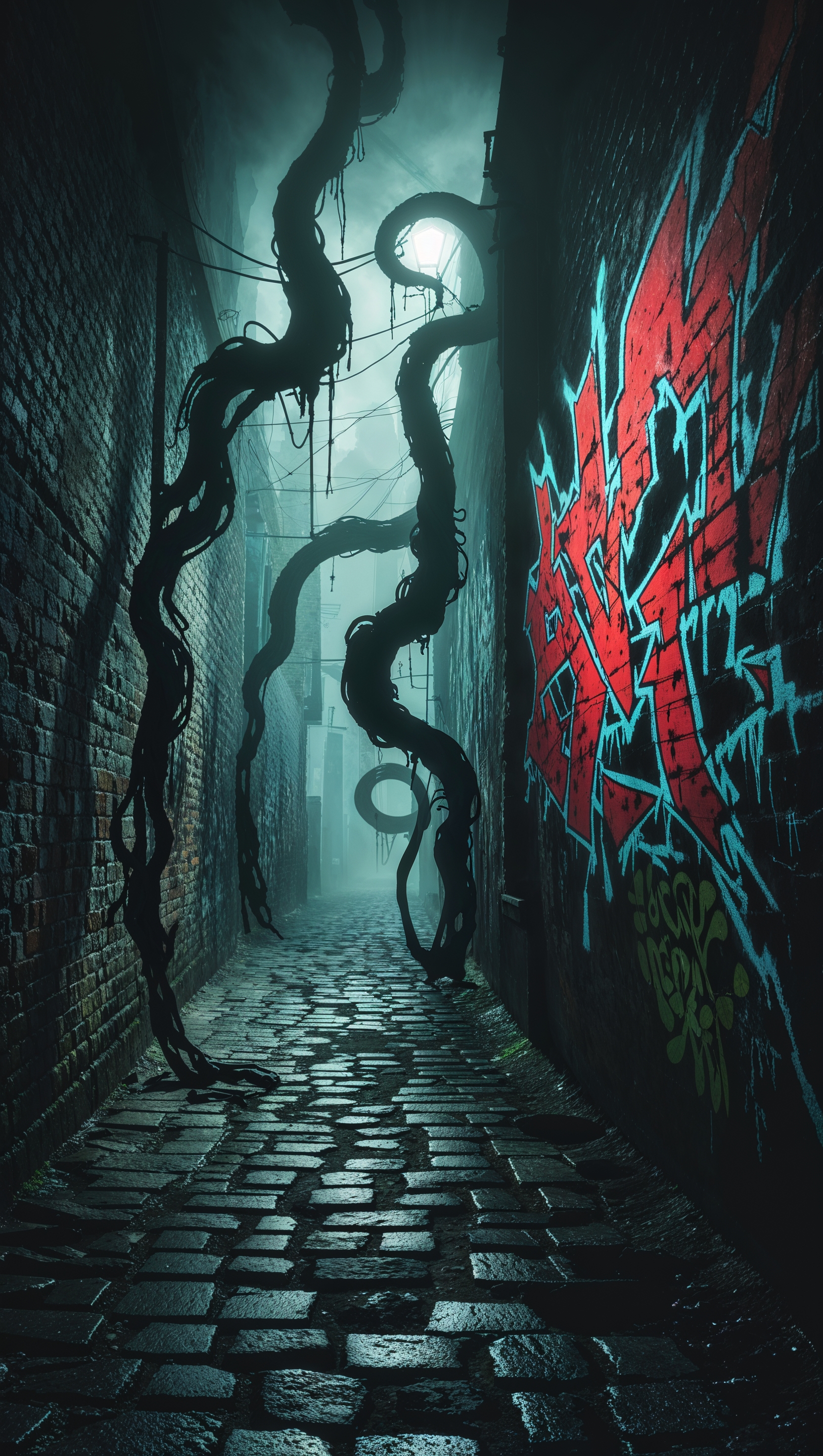 1664x2944 Dark alleyway with ominous graffiti, fog rolling in