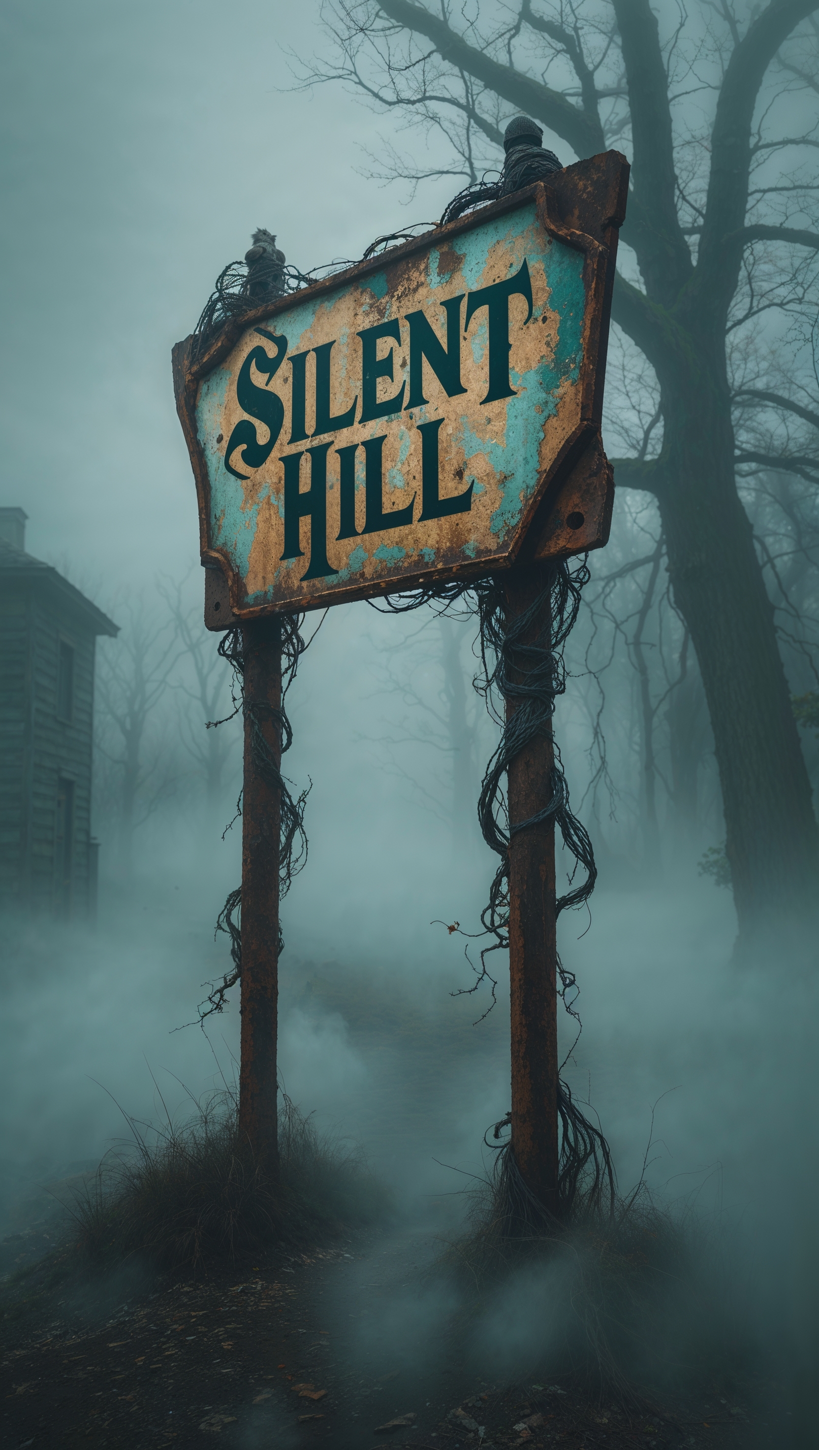 1664x2944 Silent Hill welcome sign, rusted and covered in fog