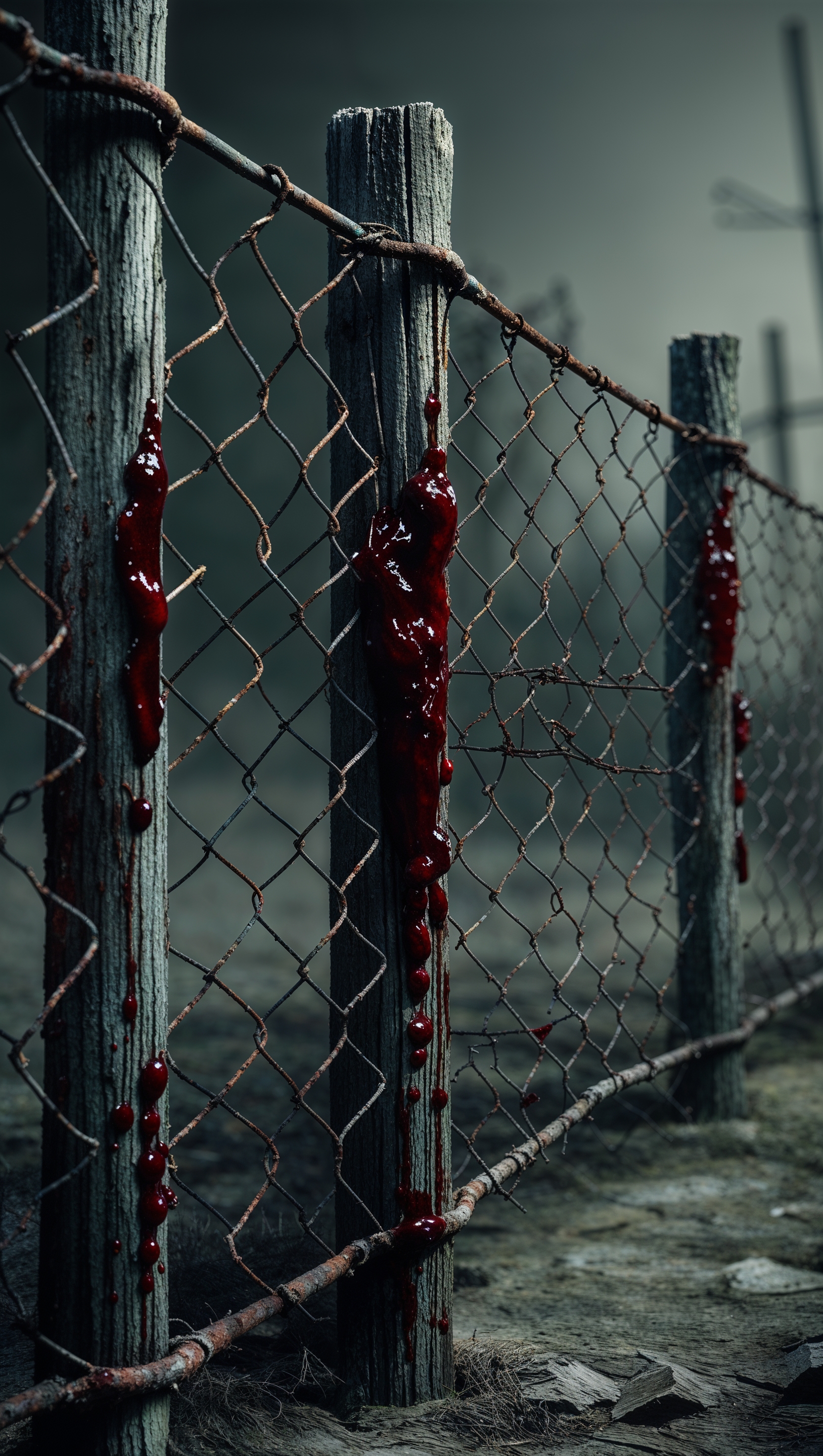 1664x2944 Rusty chain-link fence with blood splatters, horror aesthetic
