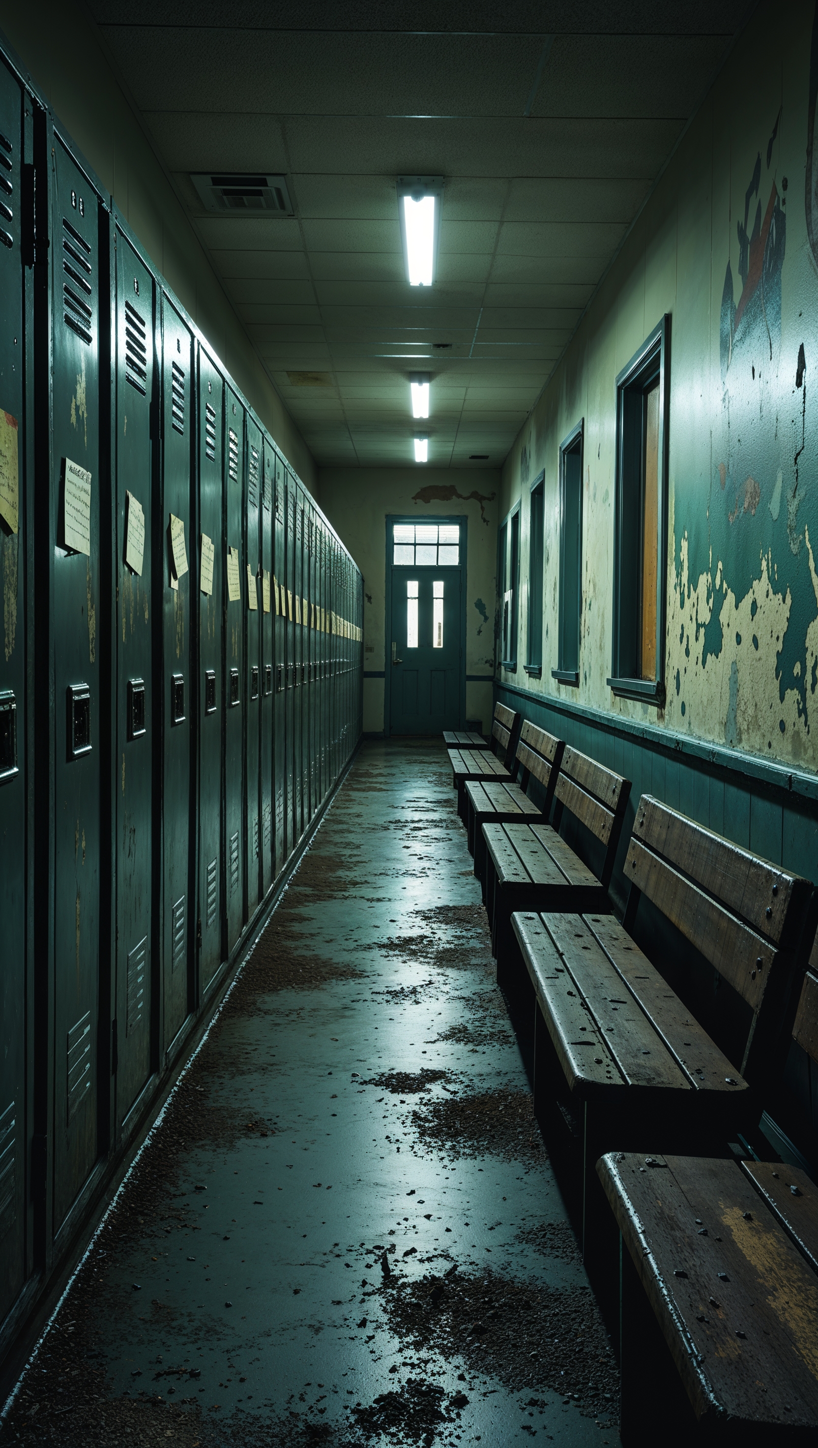 1664x2944 Creepy school hallway with abandoned lockers, eerie silence