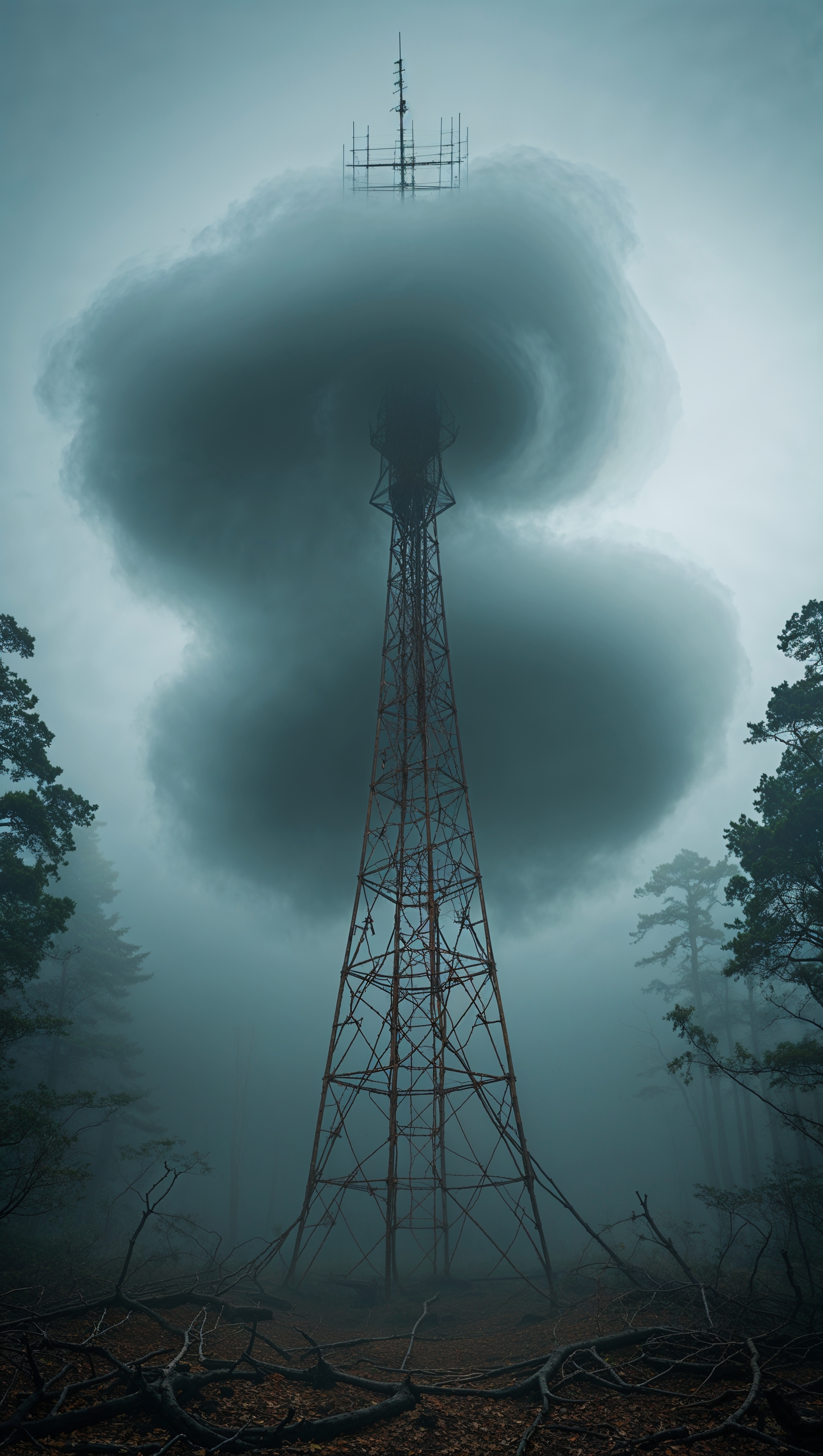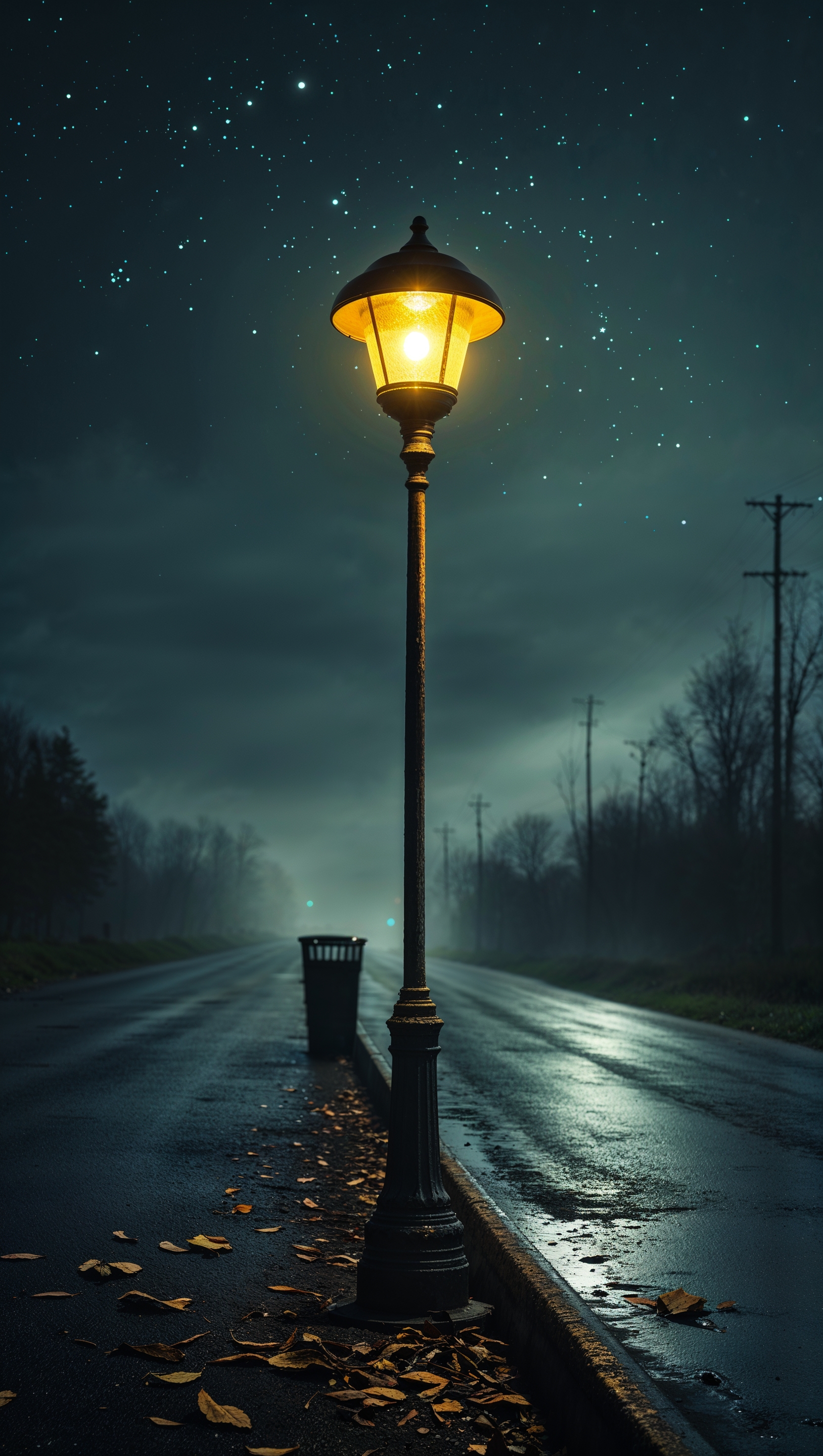 1664x2944 Fog-covered street with broken streetlights, eerie atmosphere