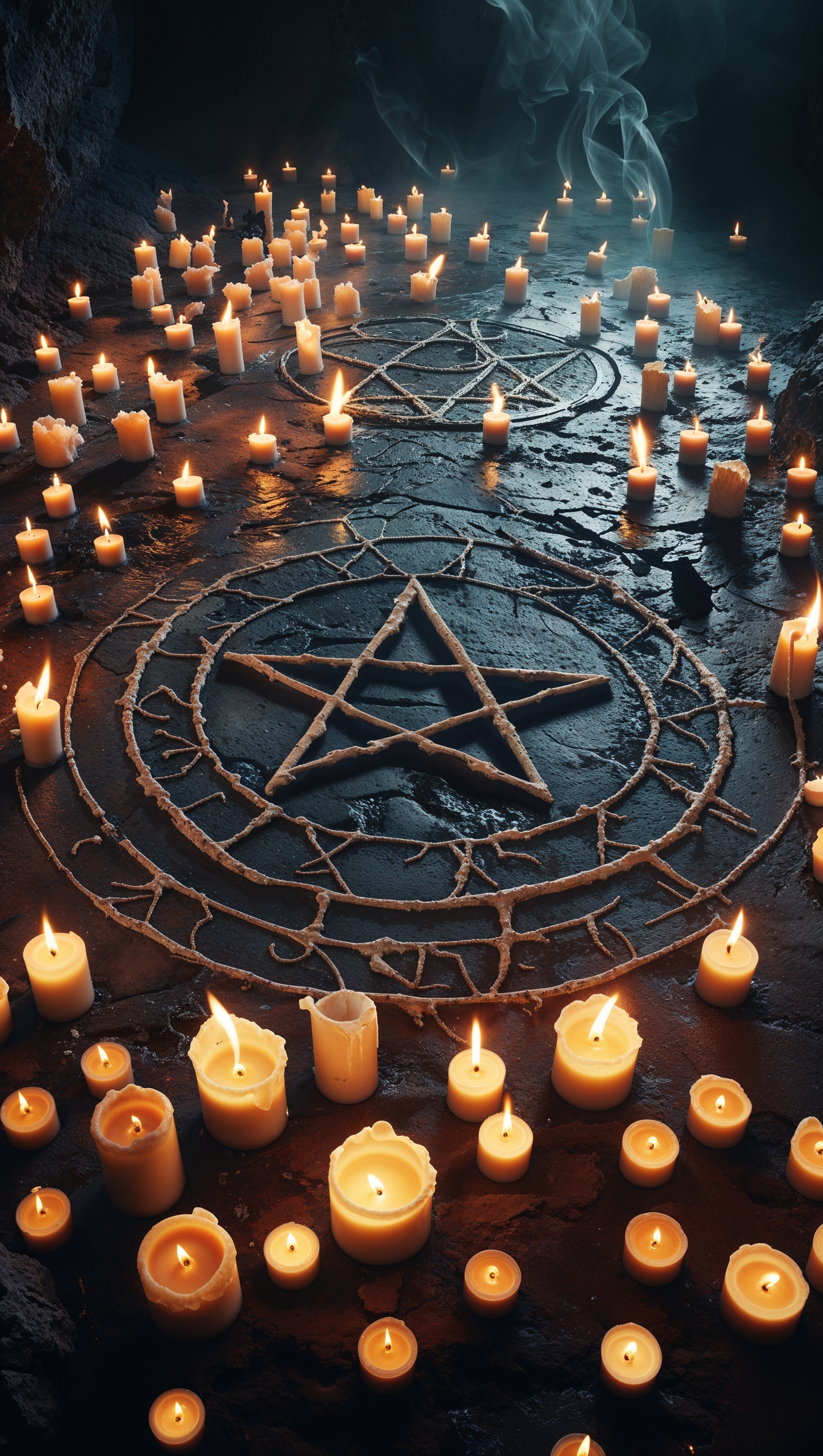 1664x2944 Melted candles surrounding an eerie occult symbol on the ground
