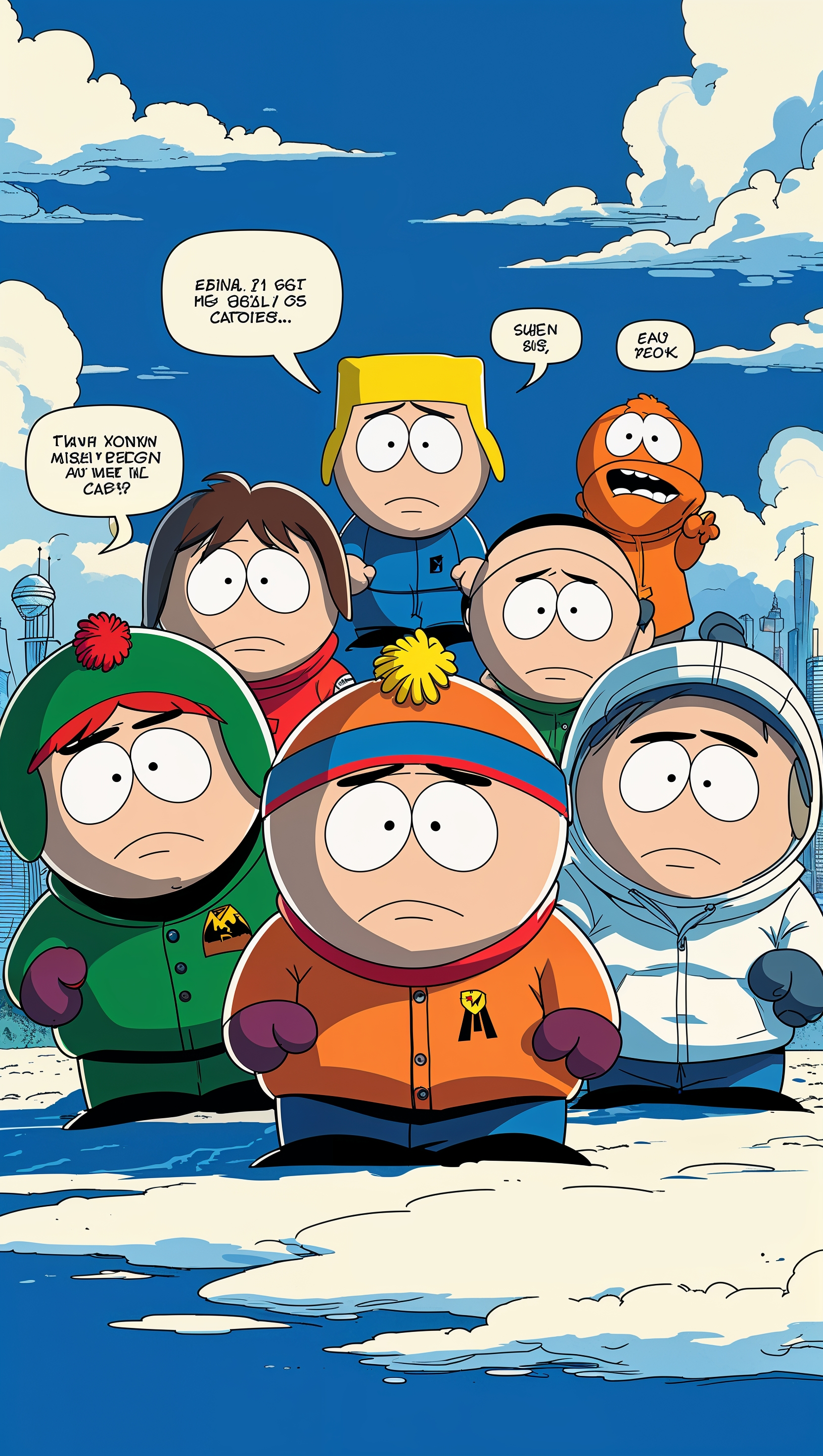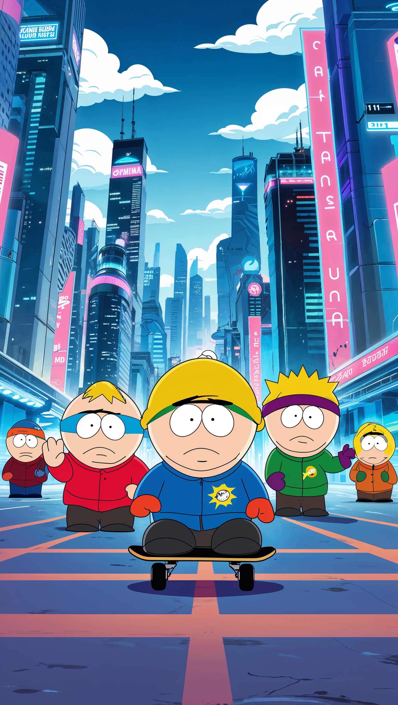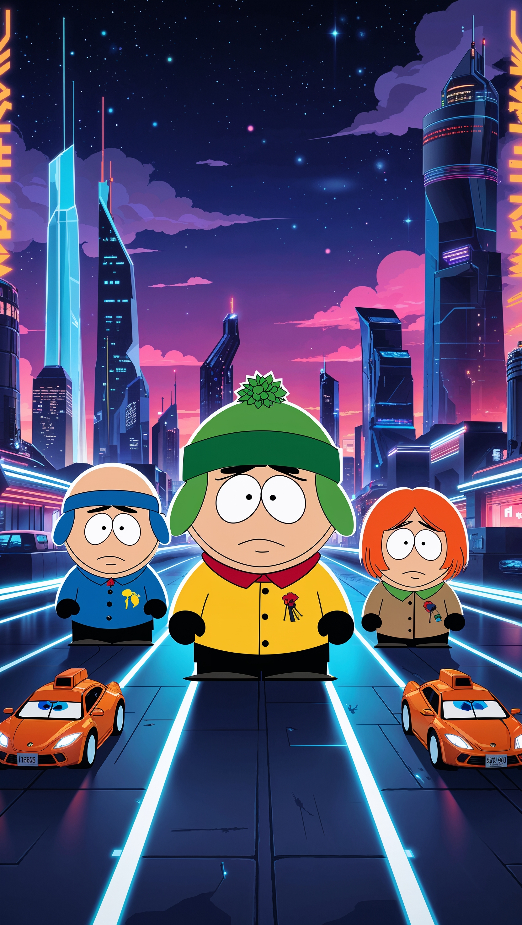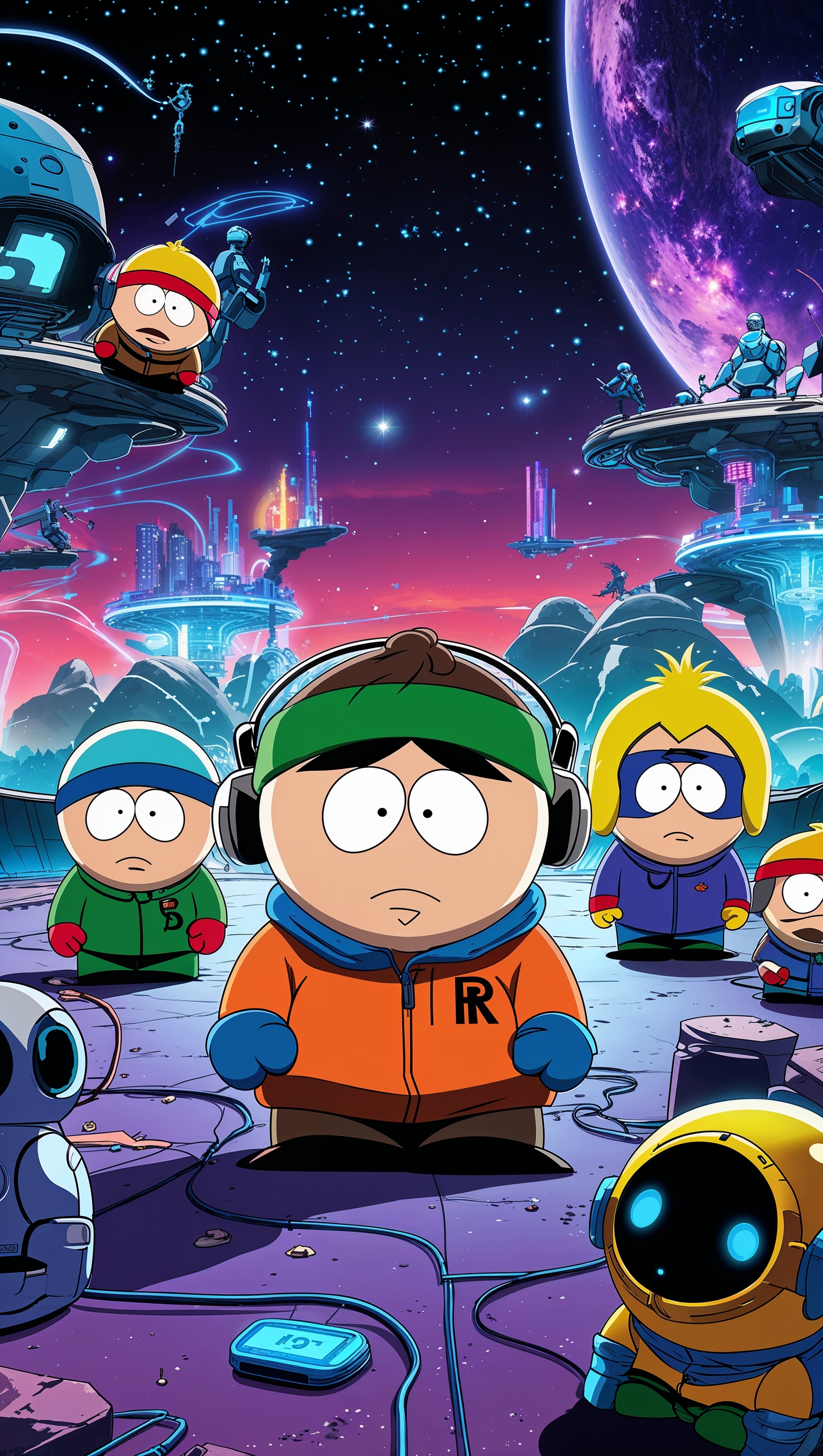 Design a futuristic South Park wallpaper with characters for iPhone 1664x2944 Design a futuristic South Park wallpaper with characters for iPhone
