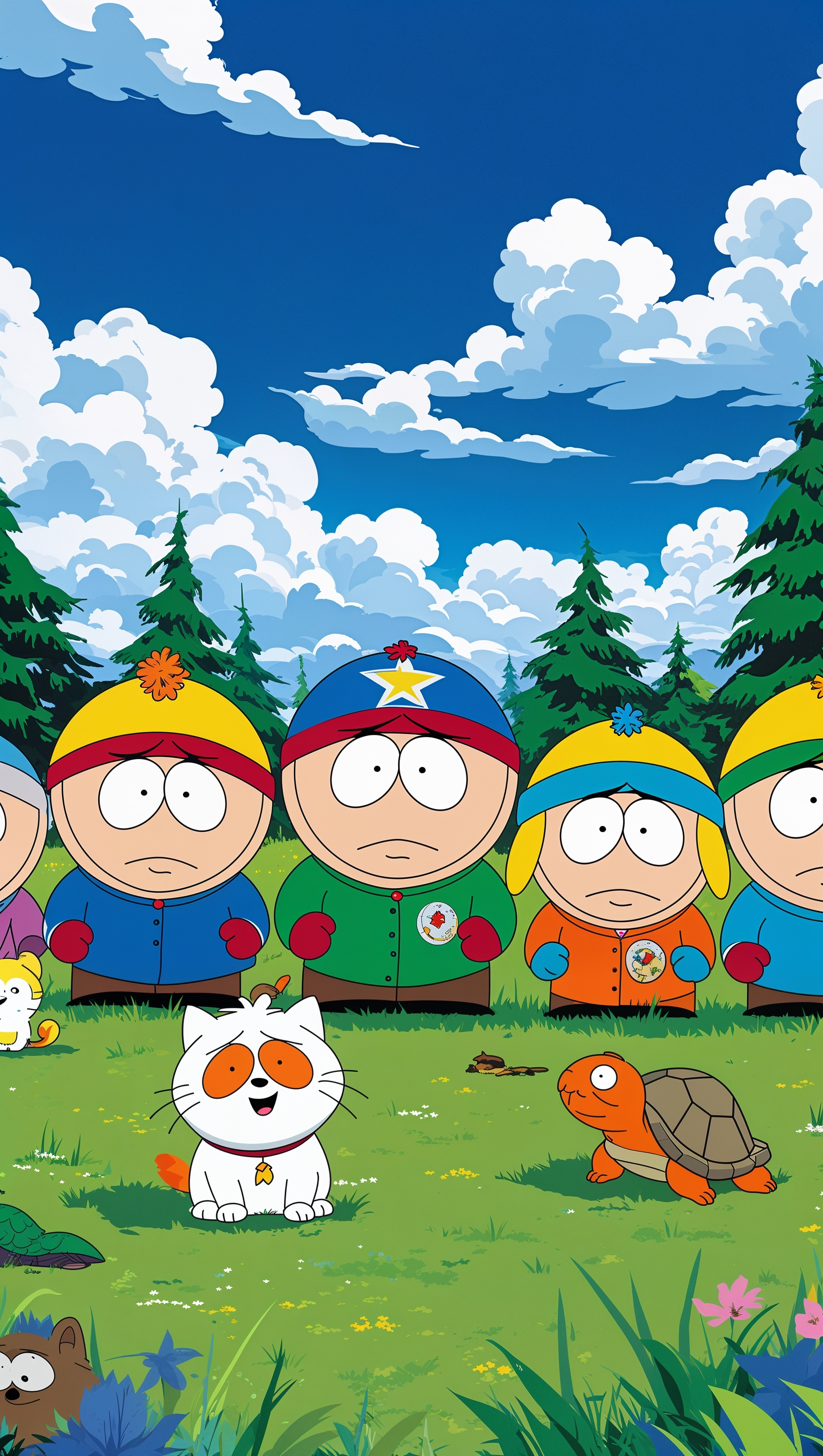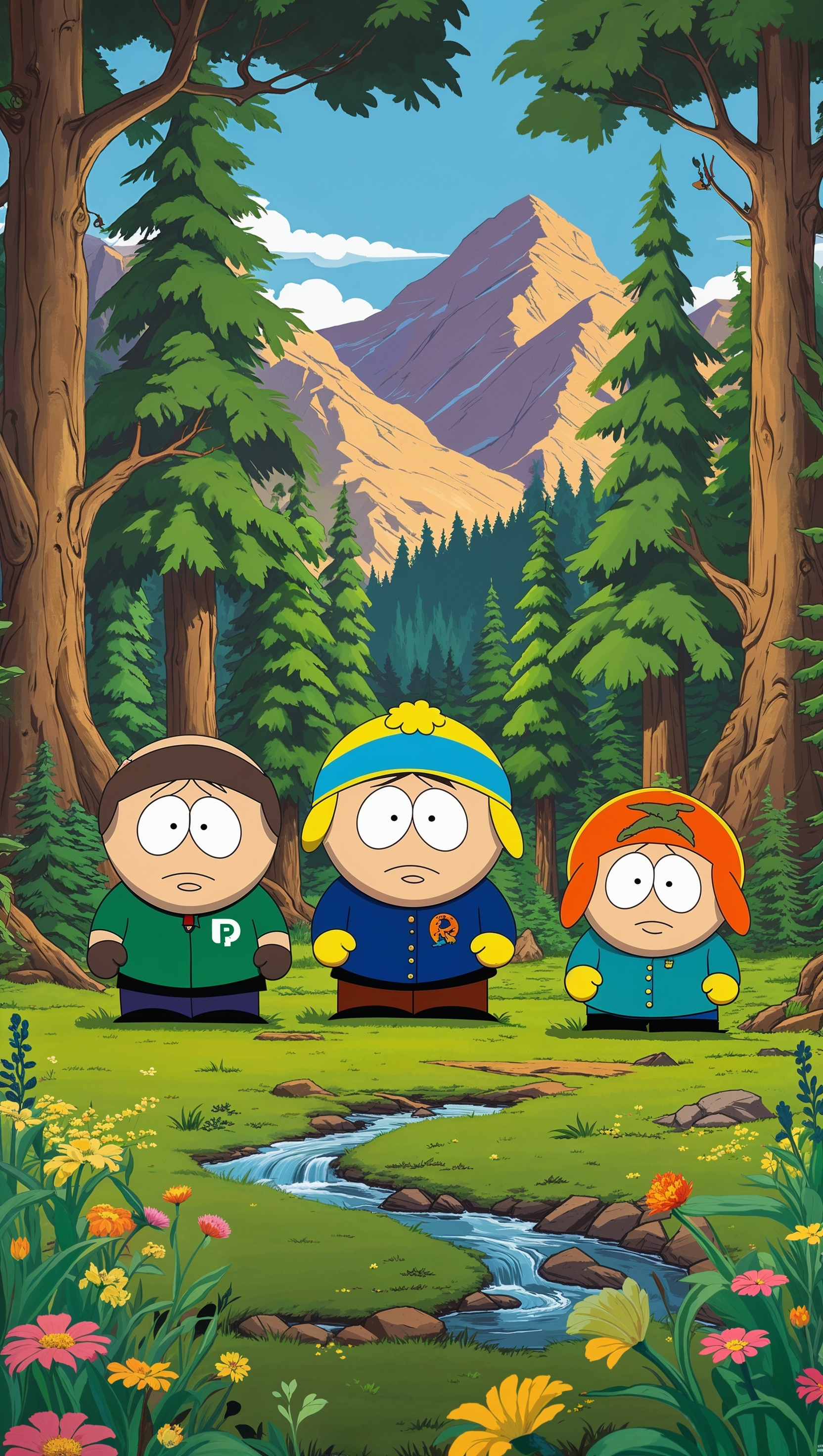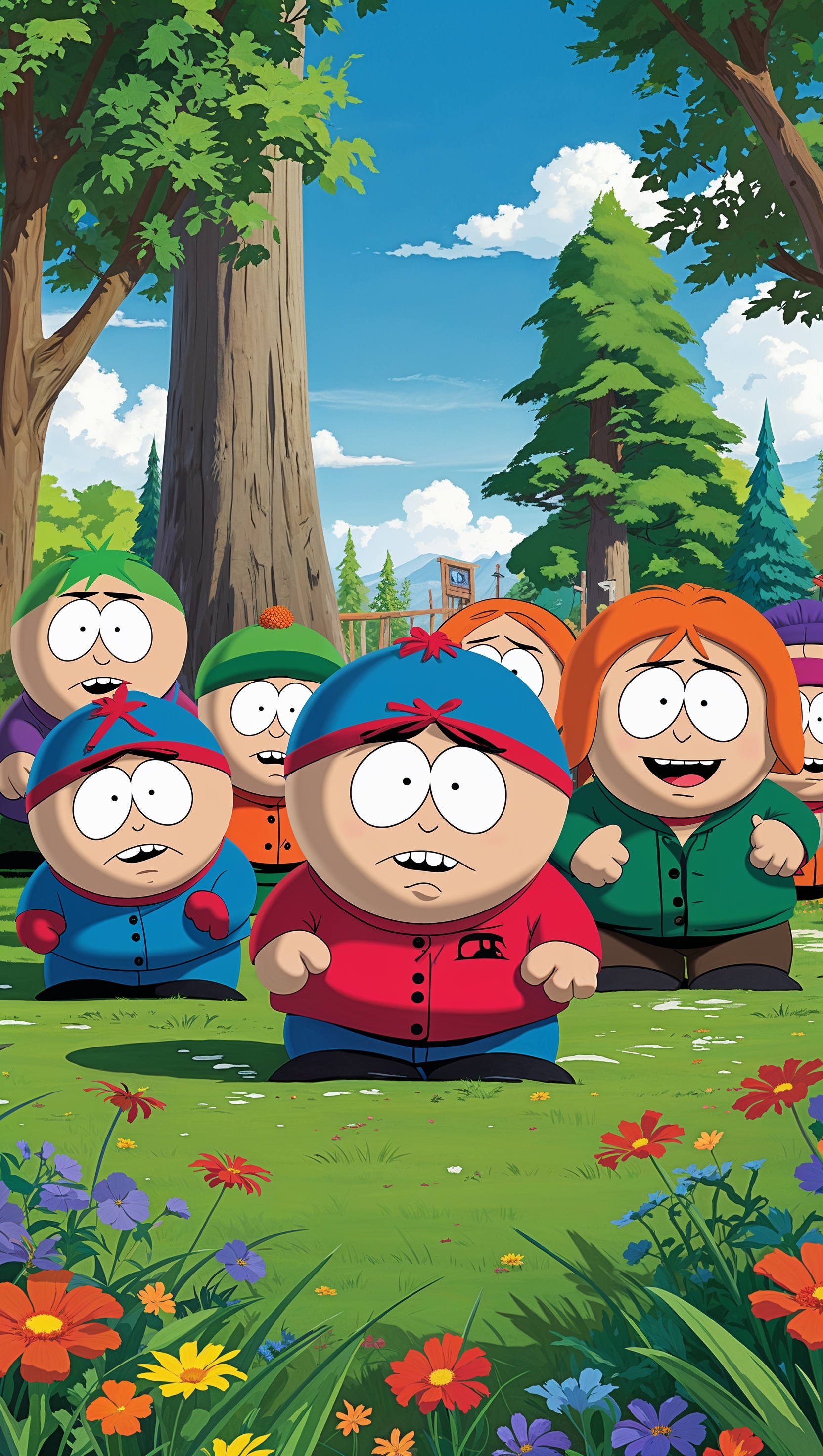Create a South Park-themed wallpaper featuring characters in a green, natural environment for iPhone 1664x2944 Create a South Park-themed wallpaper featuring characters in a green, natural environment for iPhone