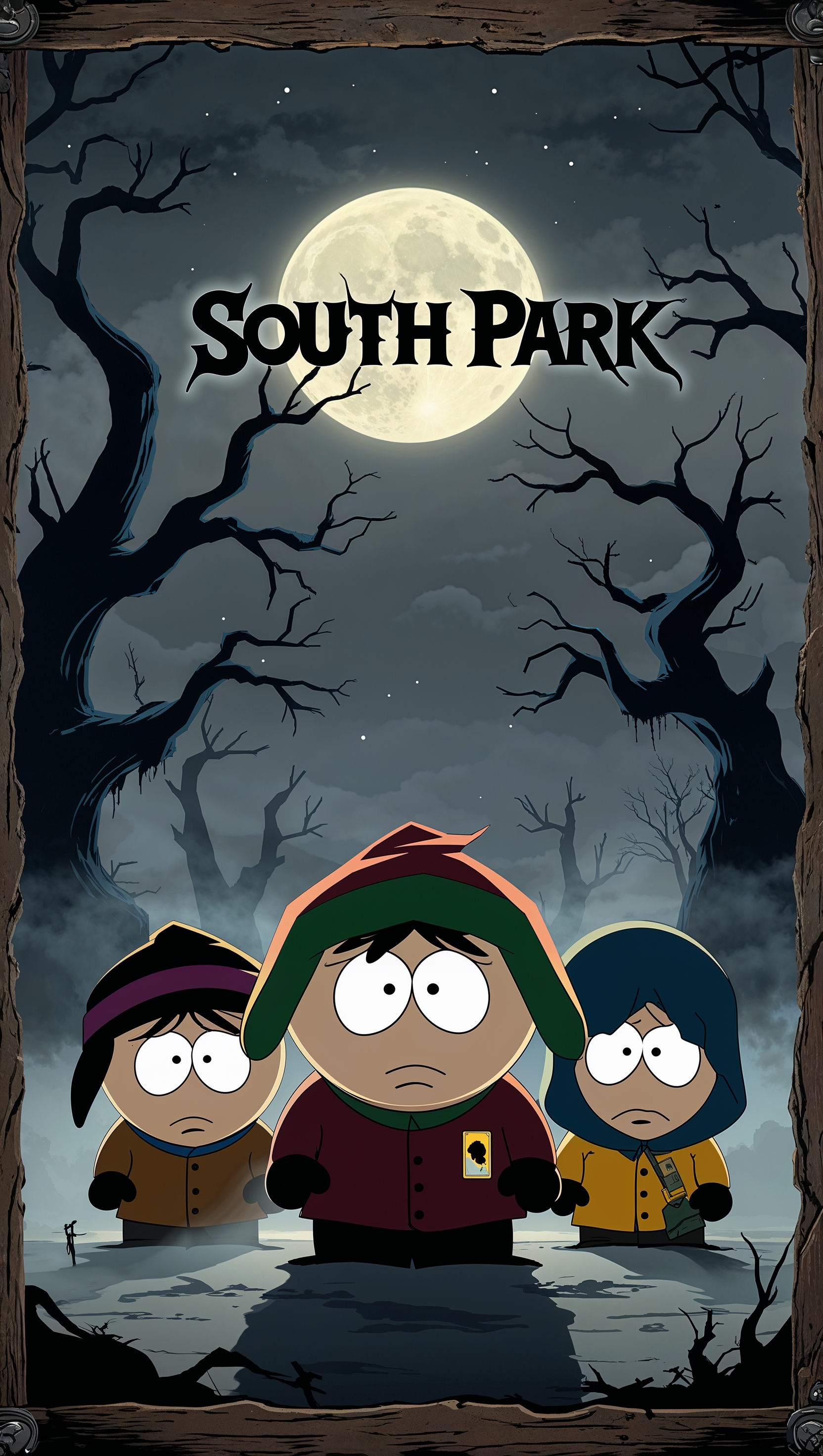 Design a South Park wallpaper with dark colors and a spooky atmosphere for iPhone 1664x2944 Design a South Park wallpaper with dark colors and a spooky atmosphere for iPhone