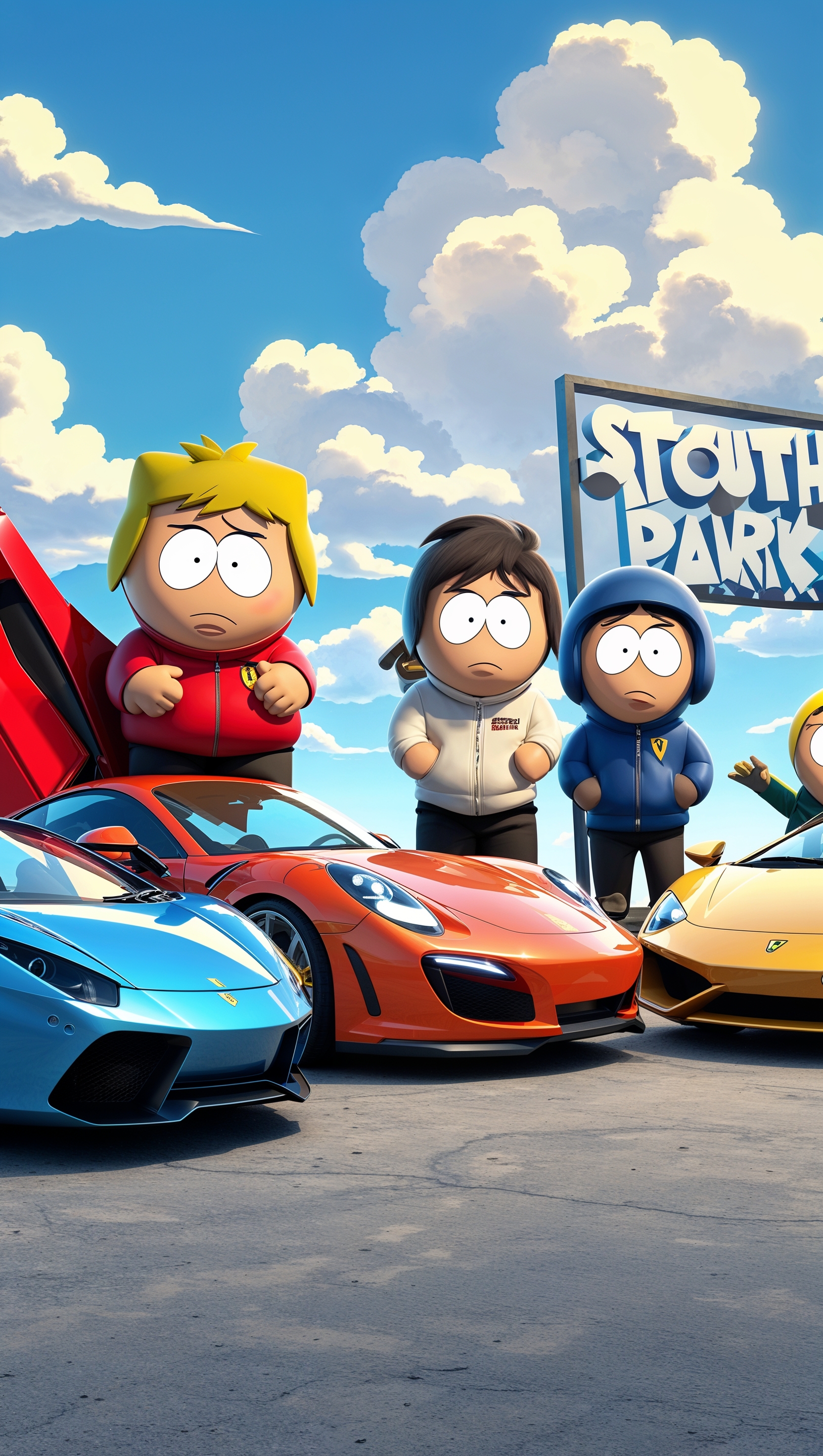 A South Park wallpaper with characters next to sports cars for iPhone 1664x2944 A South Park wallpaper with characters next to sports cars for iPhone