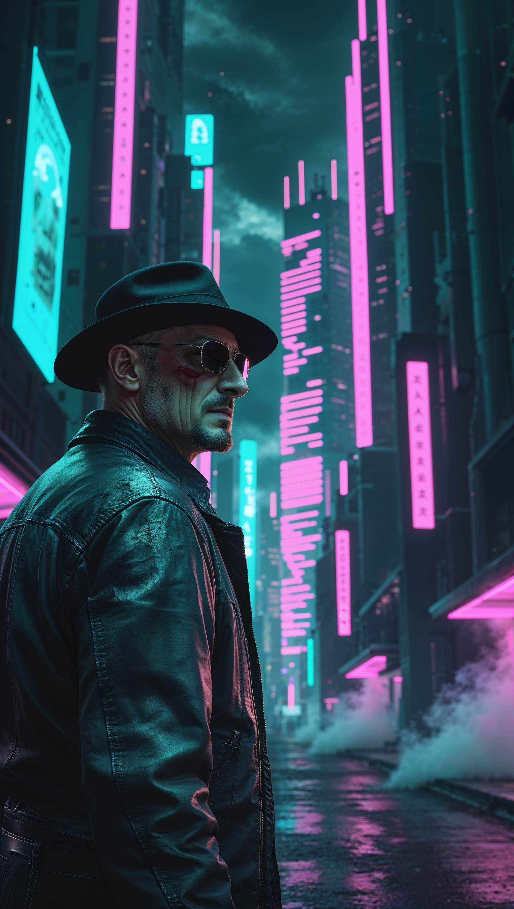 1664x2944 Create an iPhone wallpaper showing a Breaking Bad character in a futuristic cyberpunk setting