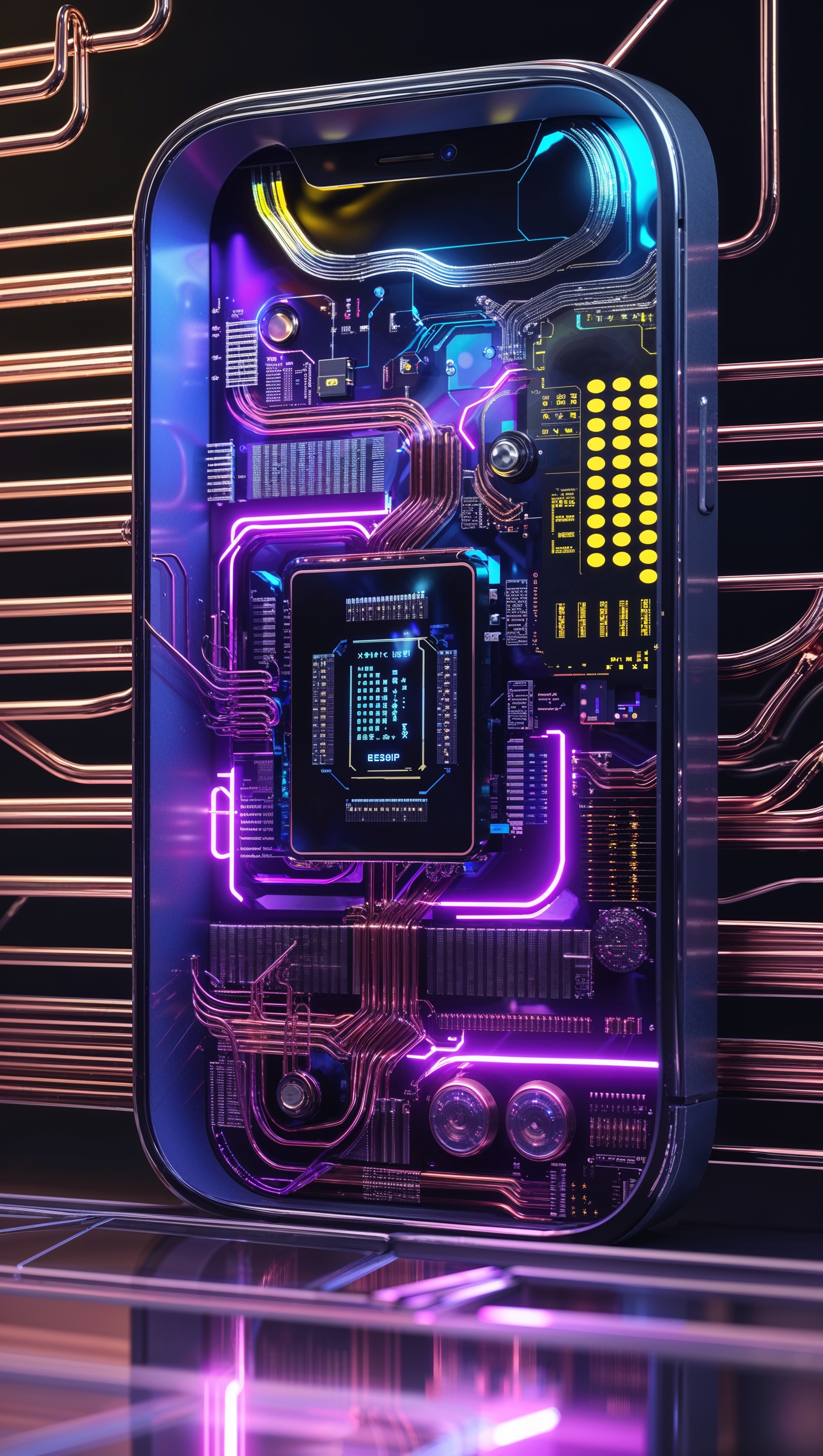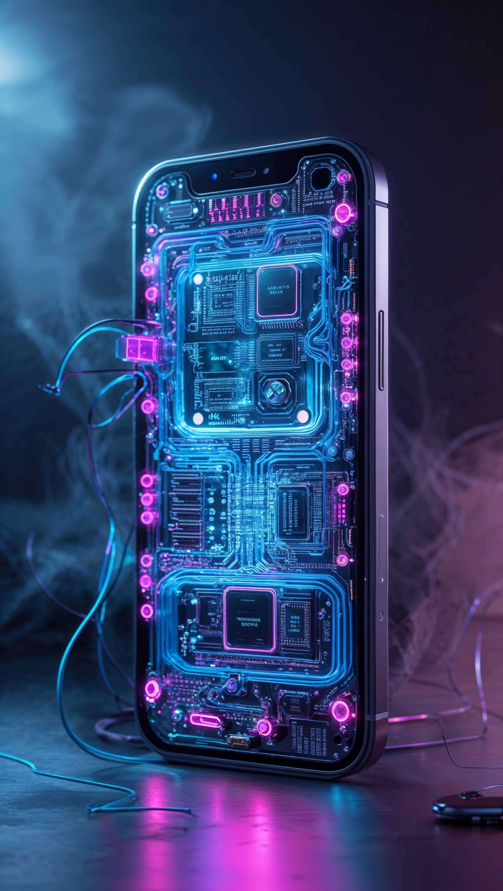 1664x2944 Cyberpunk-style internal view of an iPhone with glowing wires