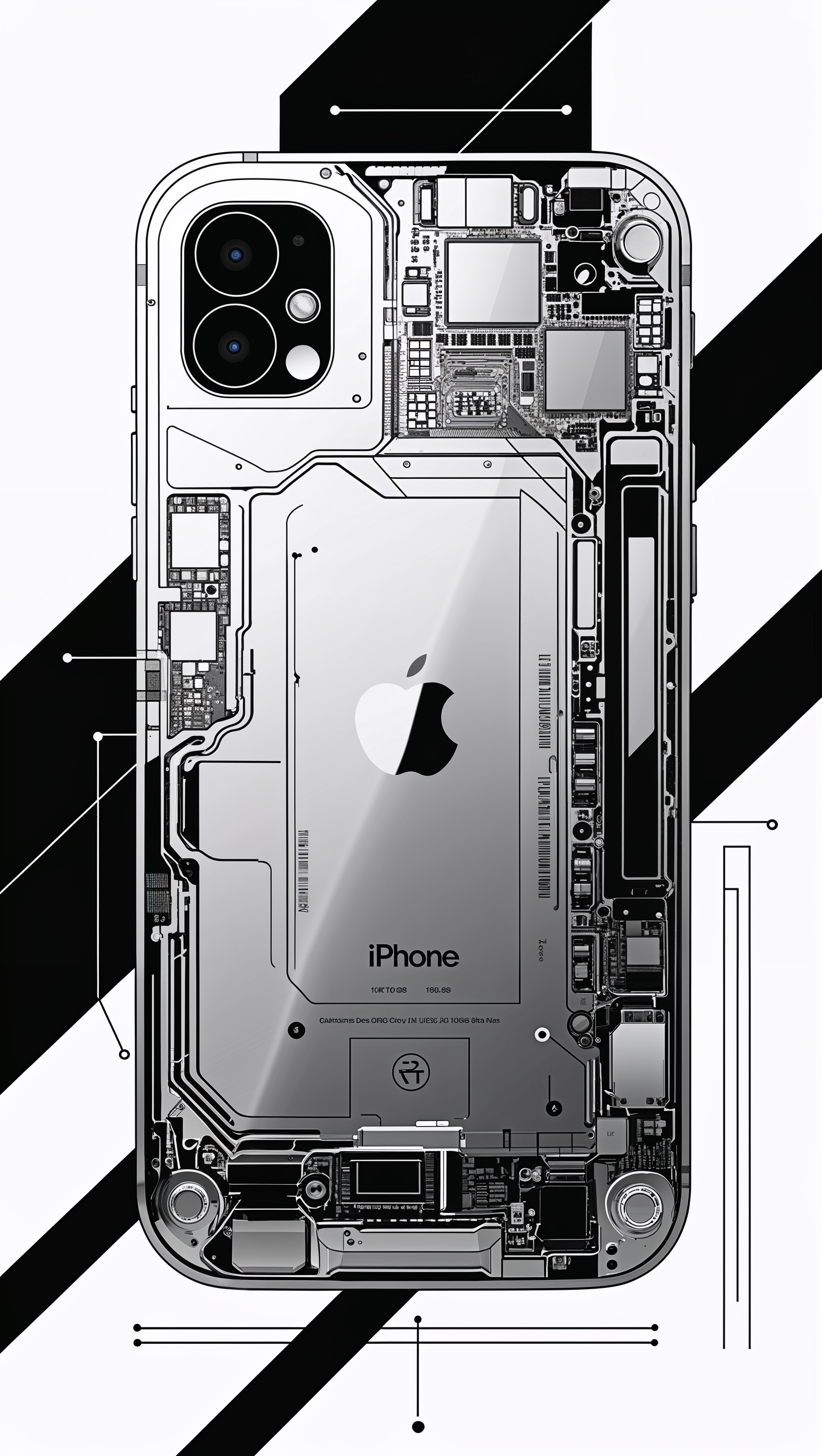 1664x2944 Minimalist schematic of iPhone internals, black and white