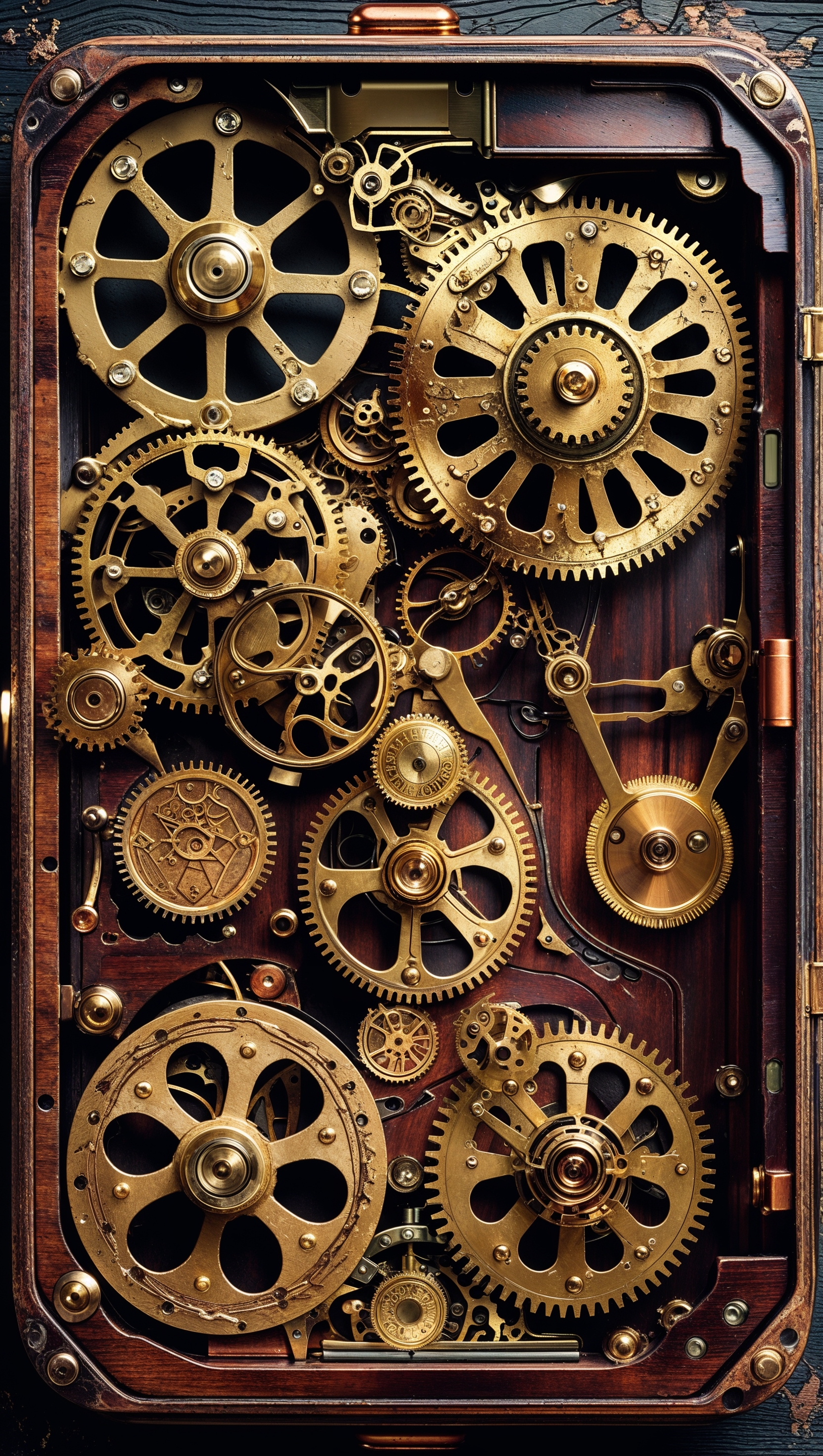 1664x2944 Steampunk iPhone internal design with gears and brass elements