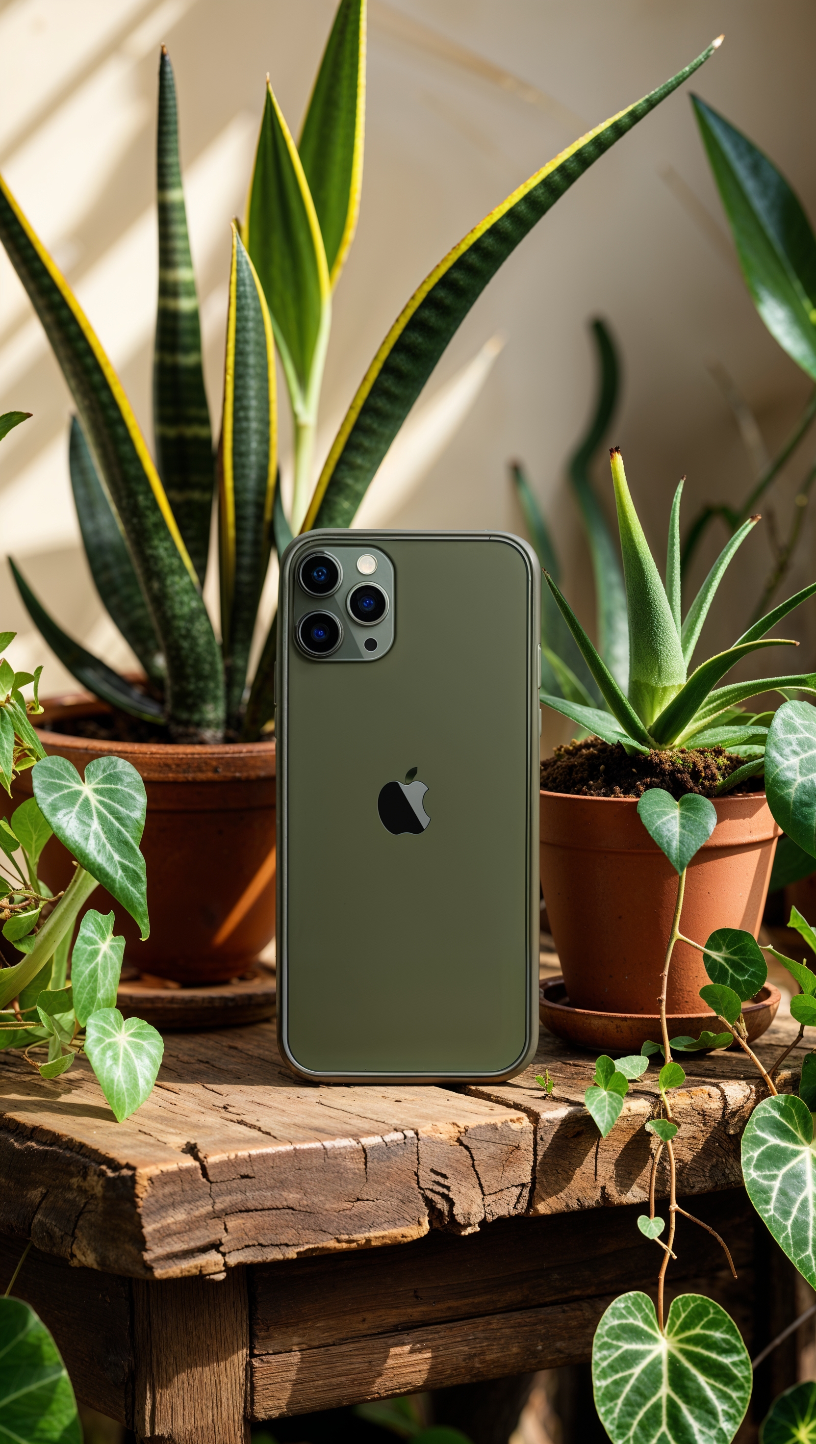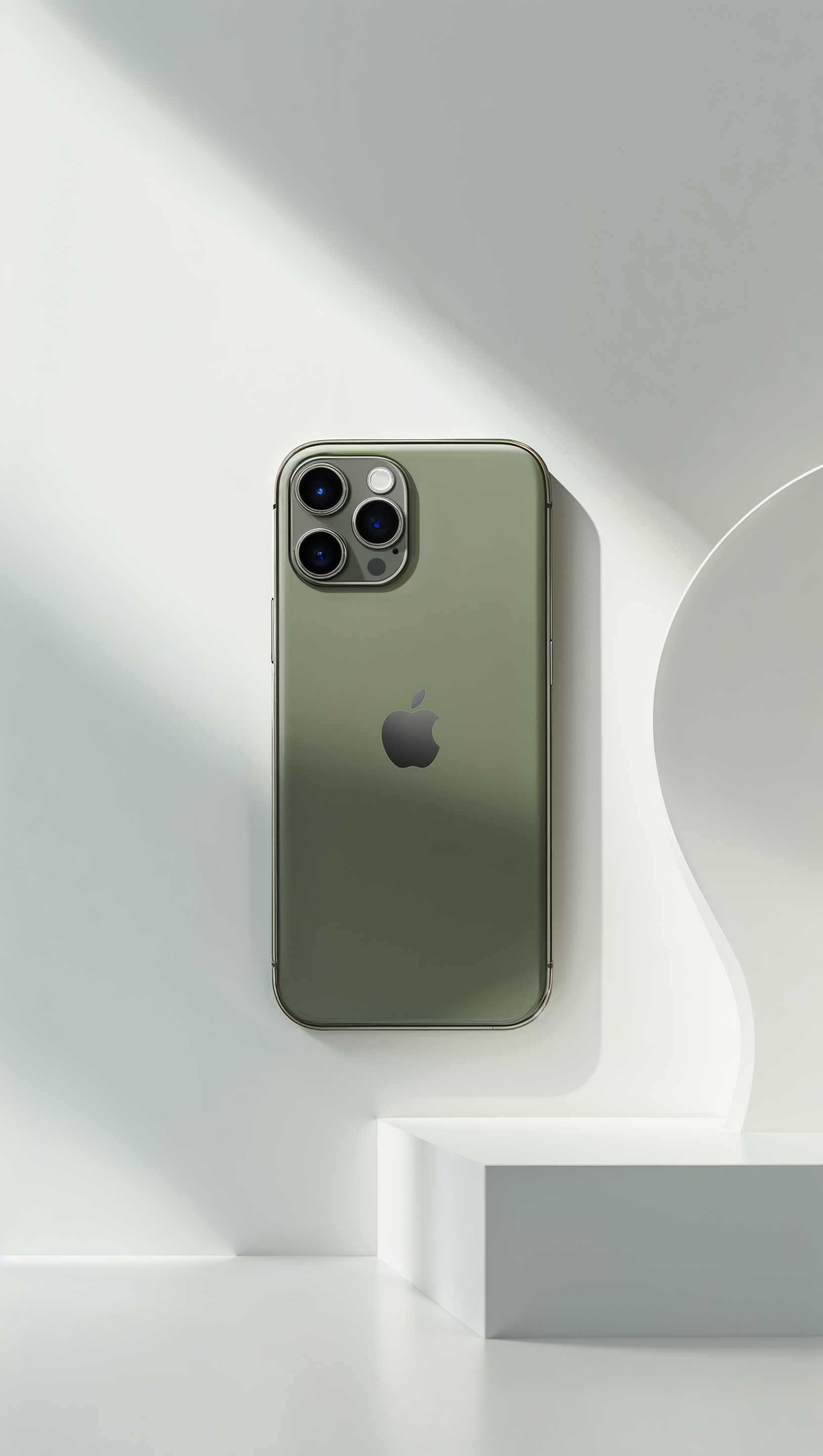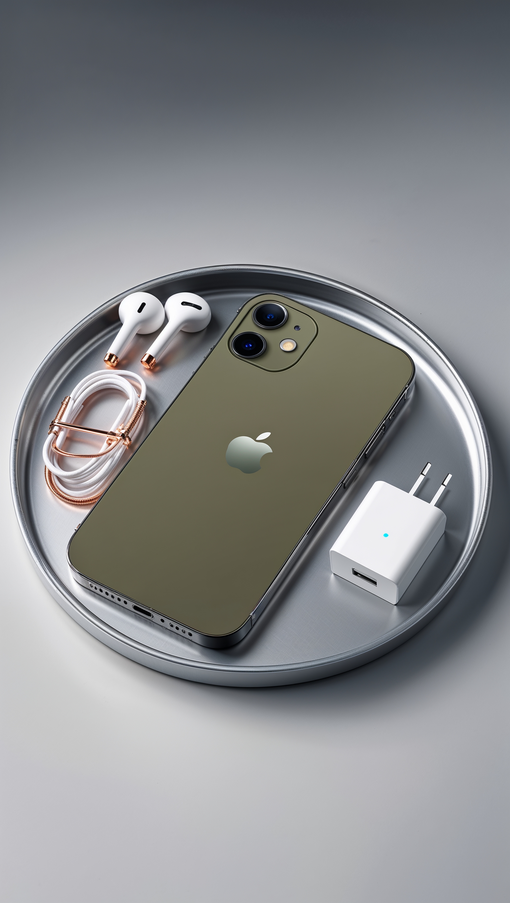 1664x2944 Olive green iPhone on a metal tray with accessories