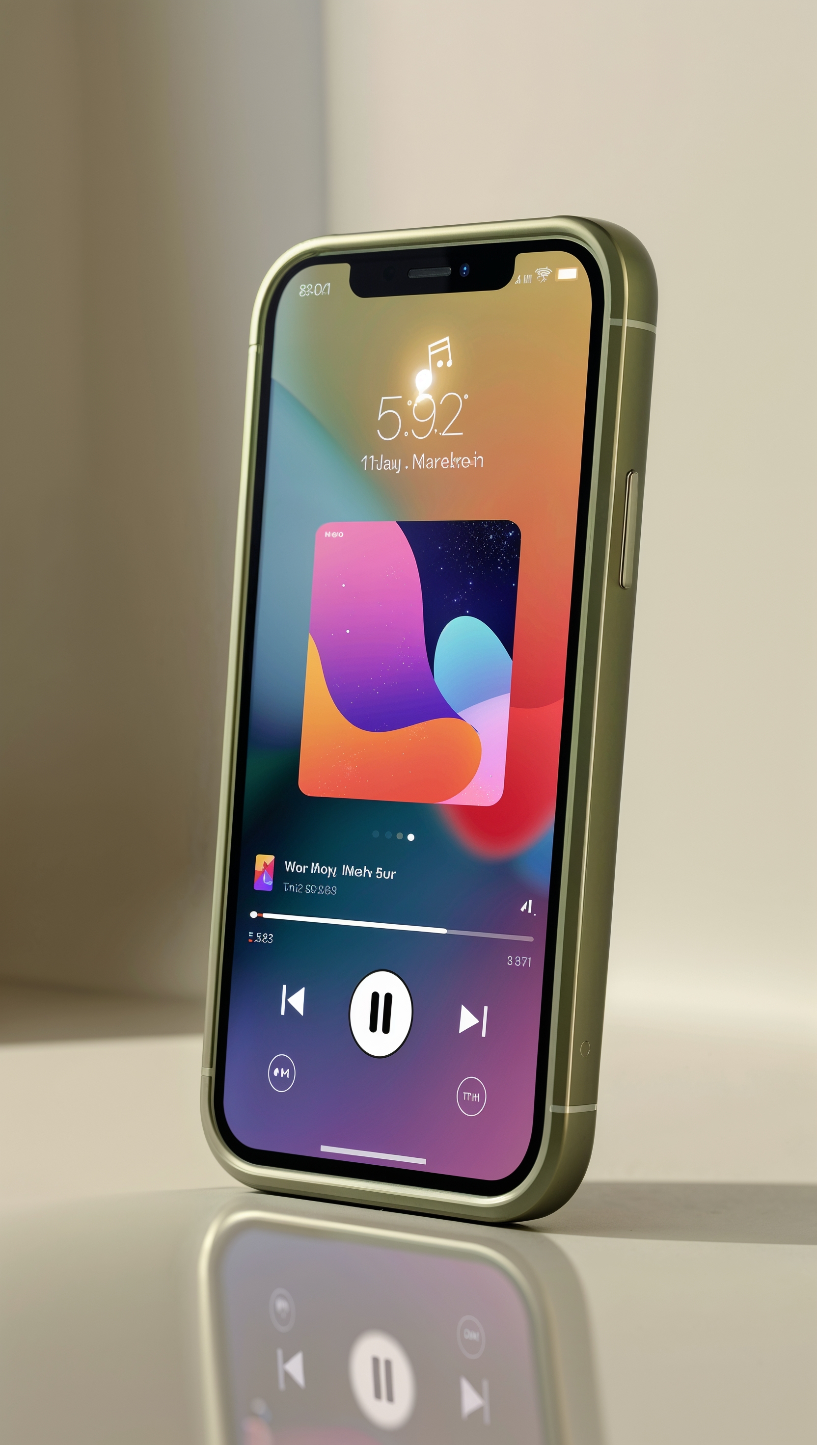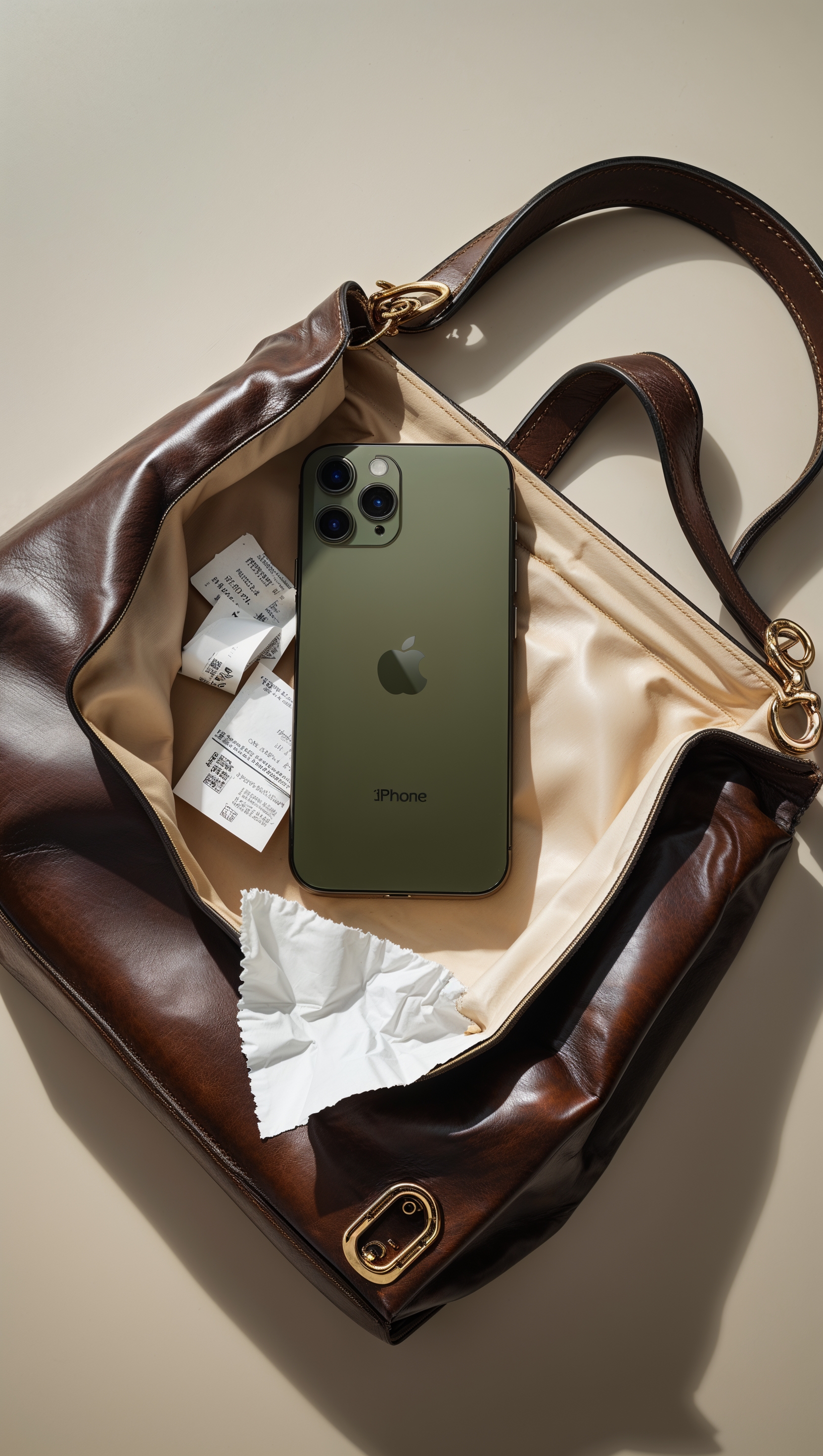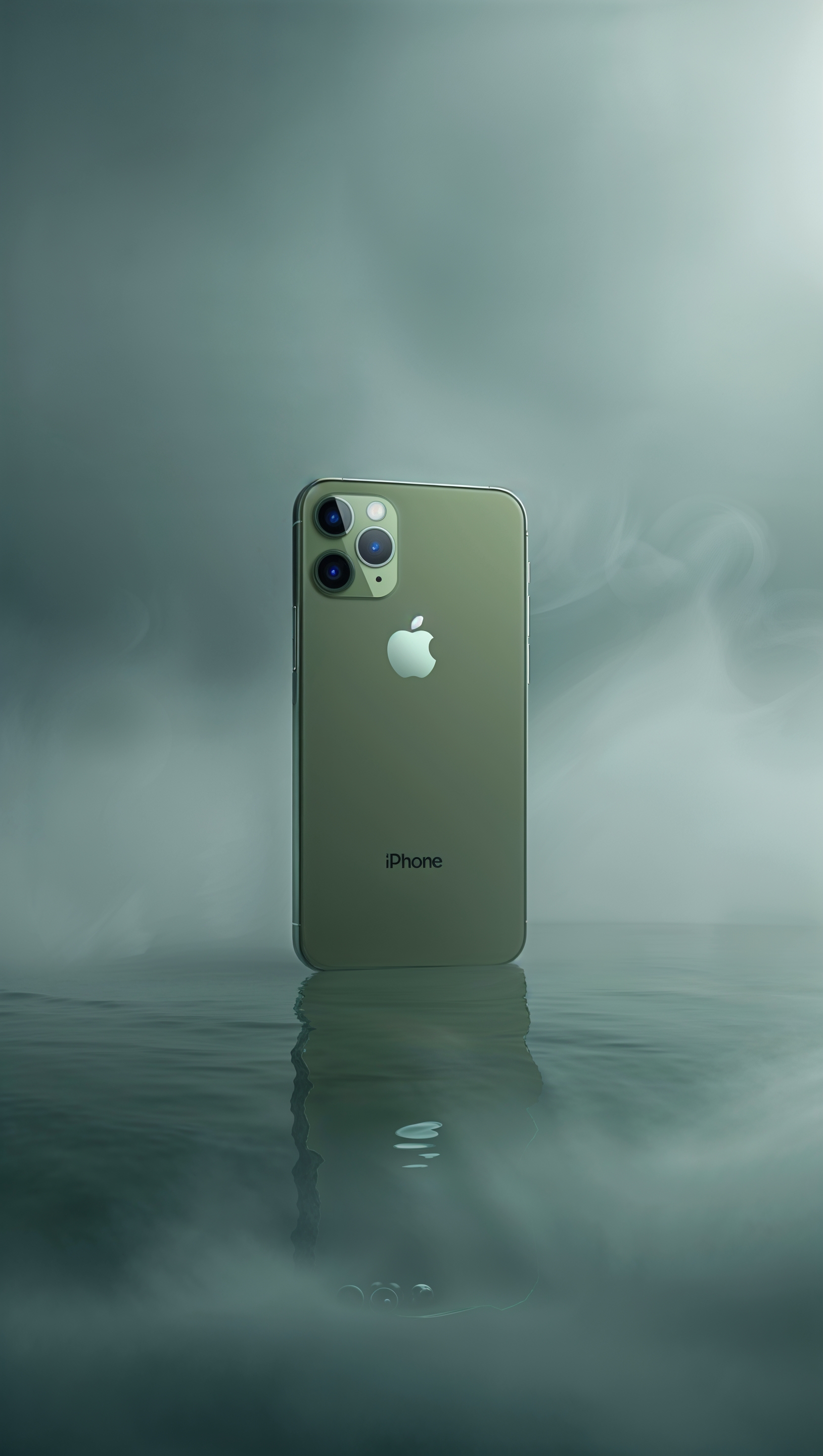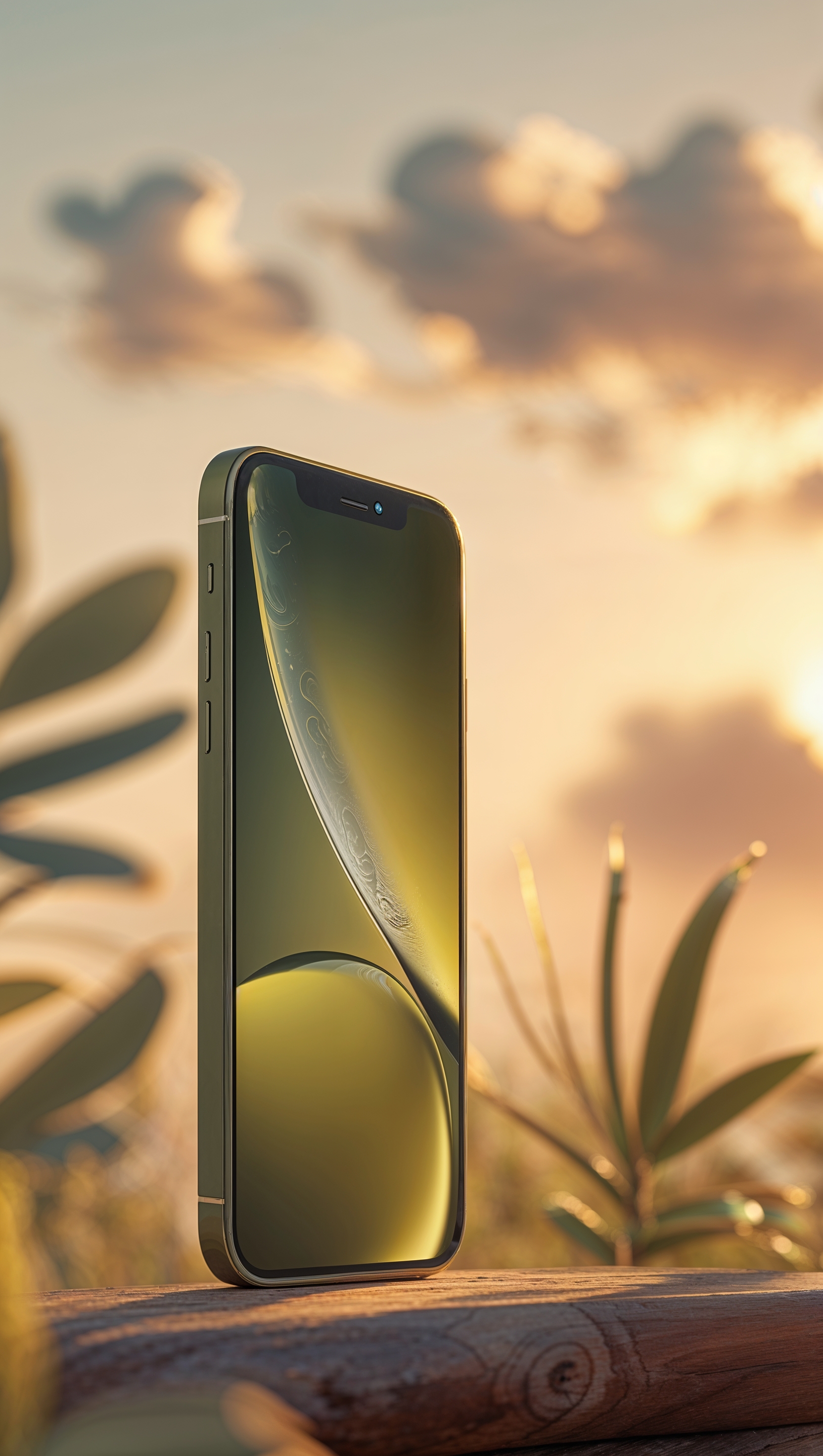 1664x2944 Olive green iPhone on a metal tray with accessories