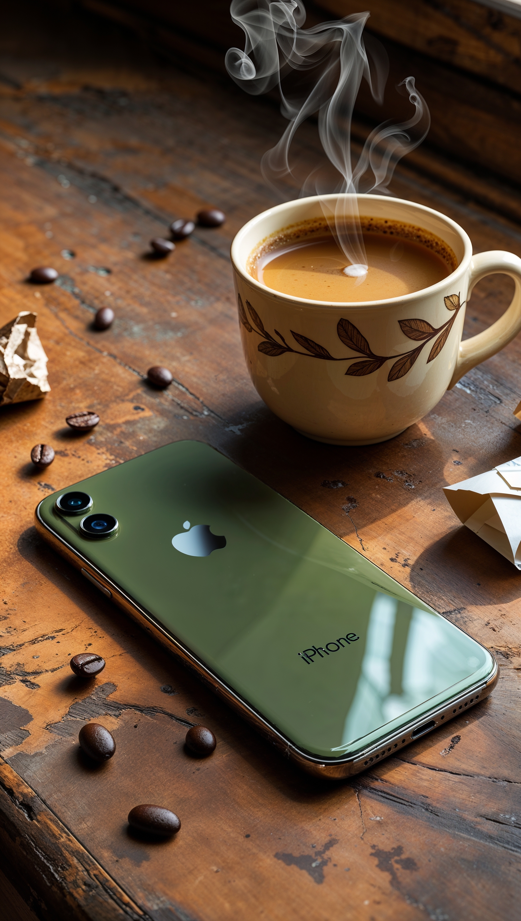 1664x2944 Olive green iPhone on a wooden table next to a cup of coffee