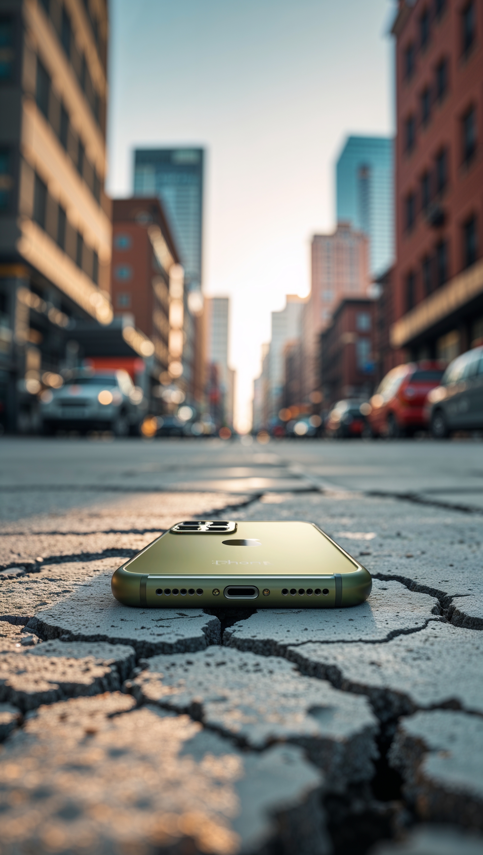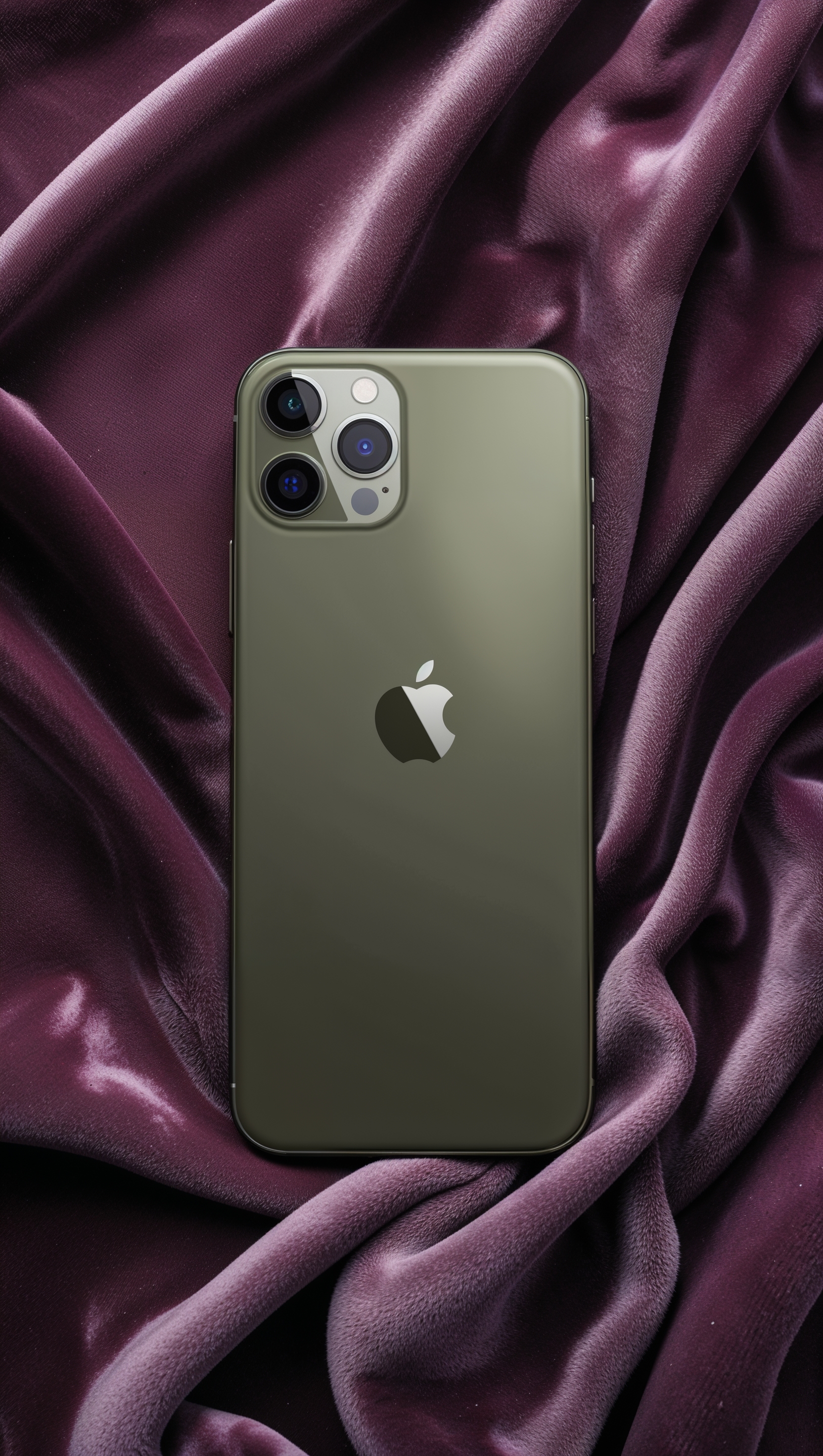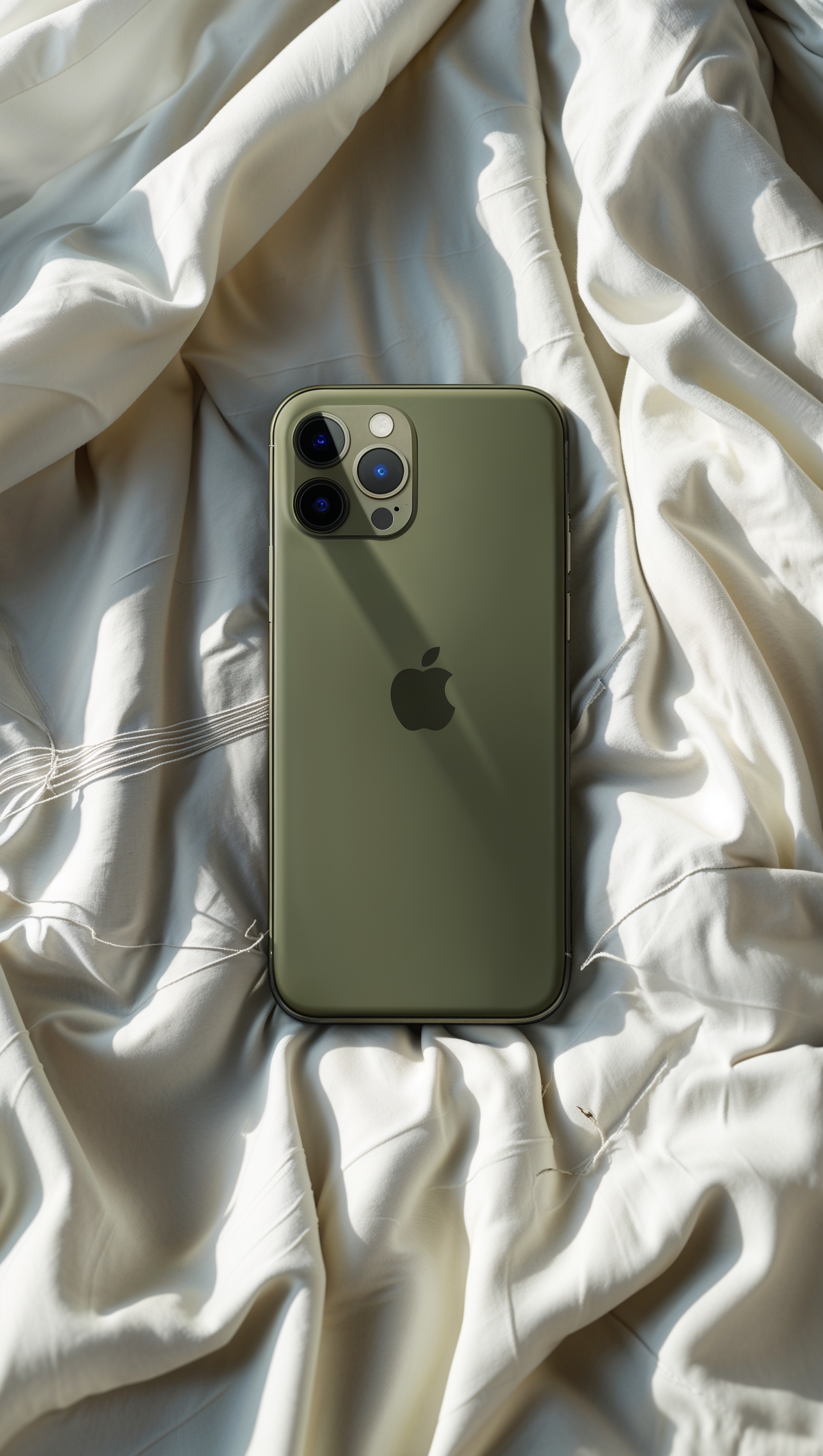 1664x2944 Olive green iPhone in a top-down view on a bed