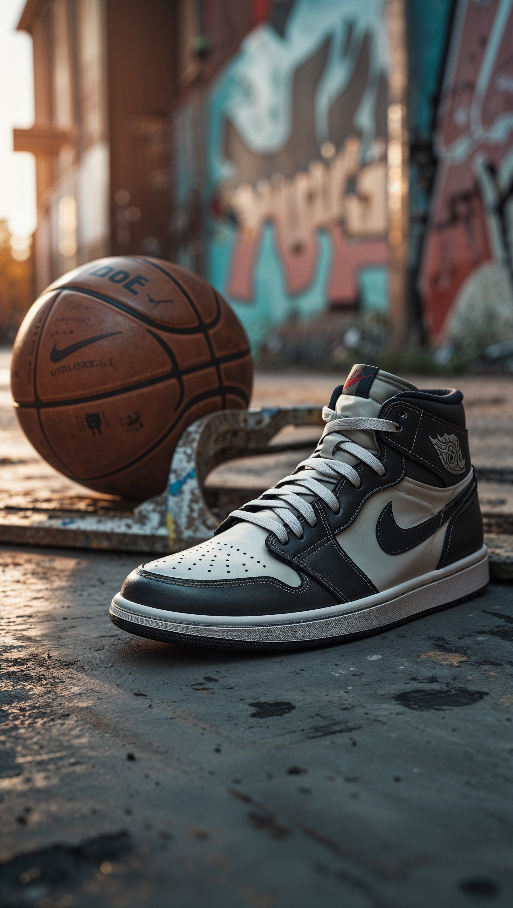 Create a 4K wallpaper of a Nike shoe next to a basketball with an urban background for an iPhone 1664x2944 Create a 4K wallpaper of a Nike shoe next to a basketball with an urban background for an iPhone