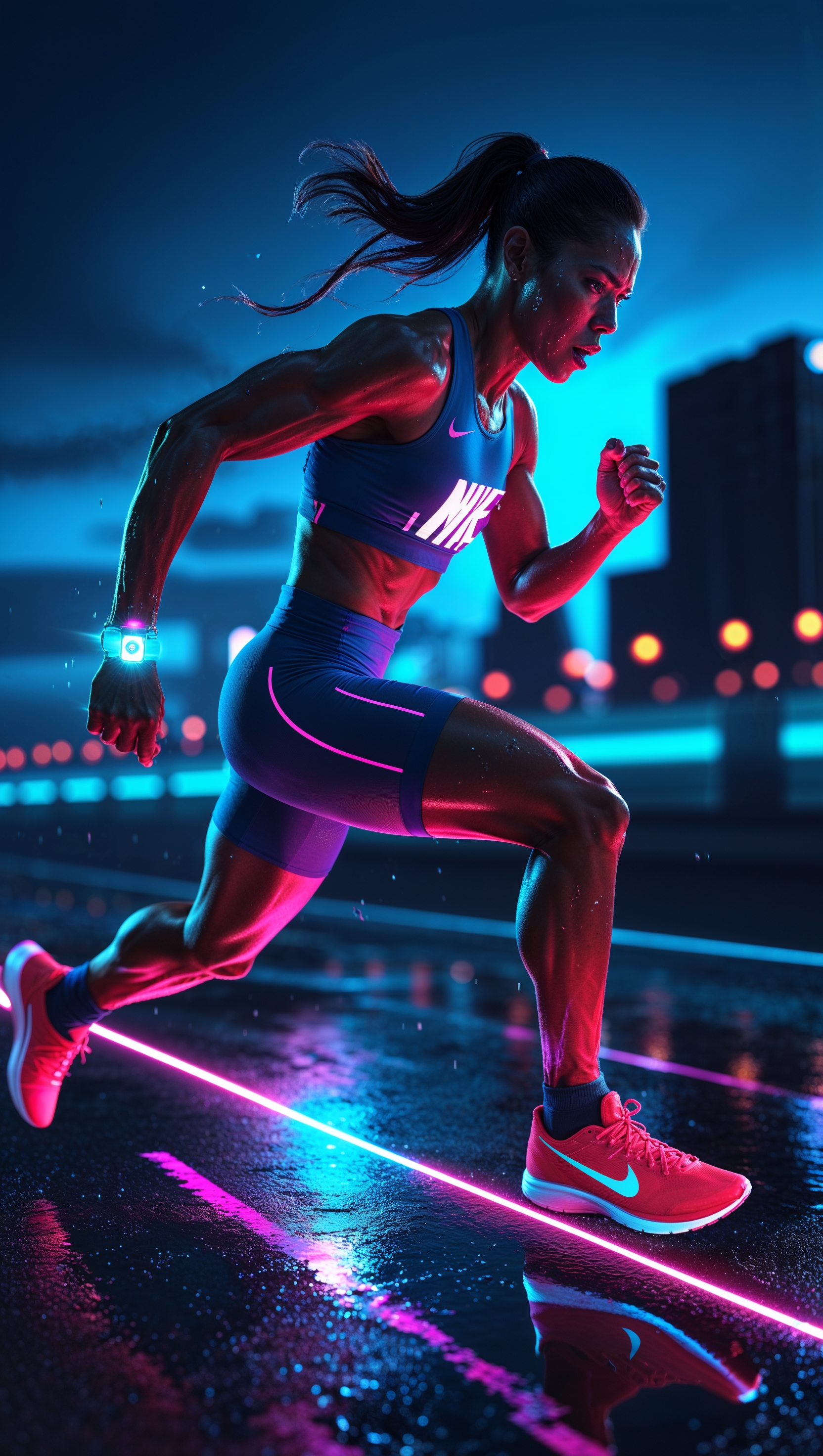 Design a 4K image of an athlete running at night in Nike gear with colorful lights for an iPhone 1664x2944 Design a 4K image of an athlete running at night in Nike gear with colorful lights for an iPhone