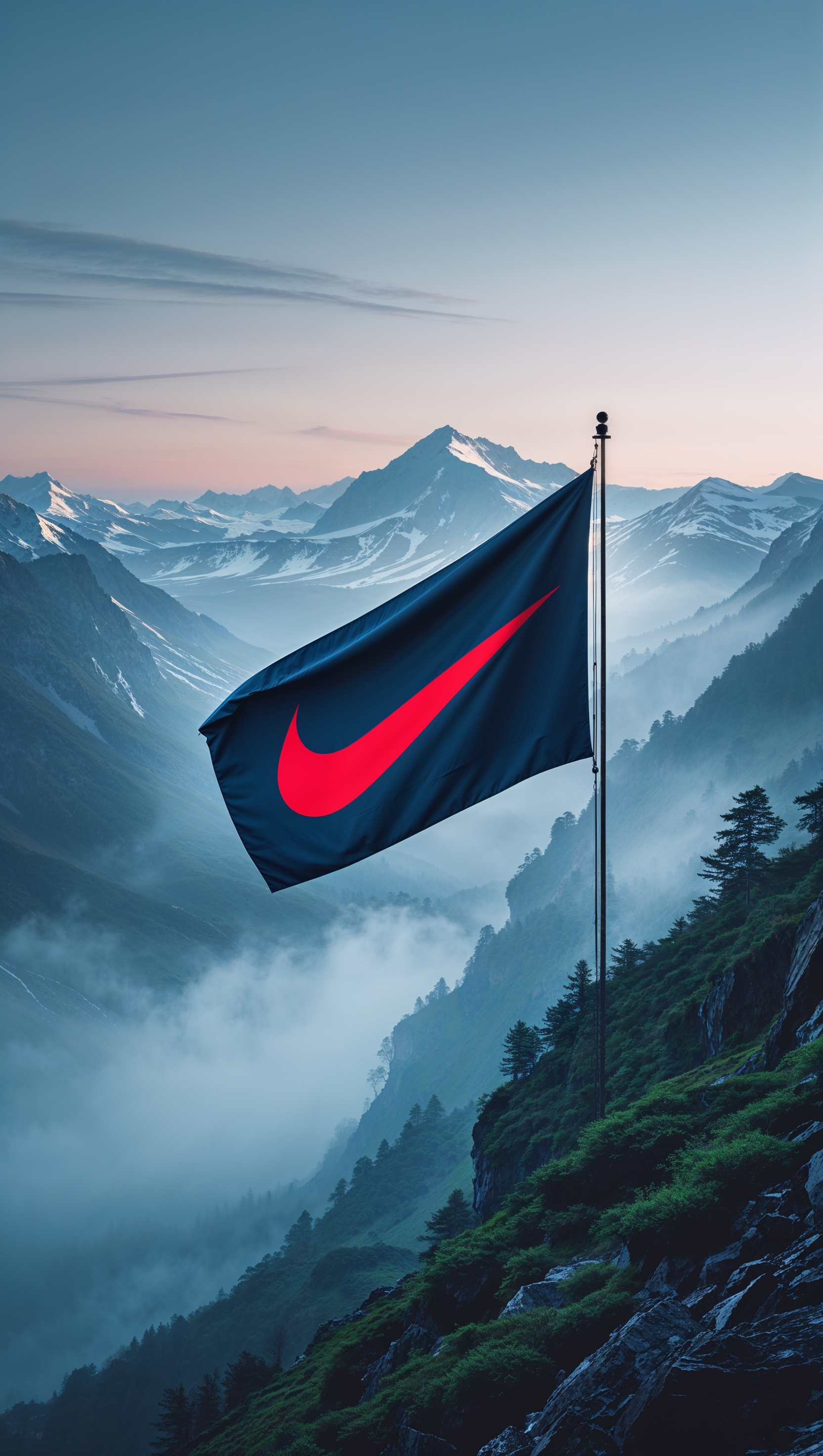 Design a 4K wallpaper of a Nike flag with a mountainous background for an iPhone 1664x2944 Design a 4K wallpaper of a Nike flag with a mountainous background for an iPhone