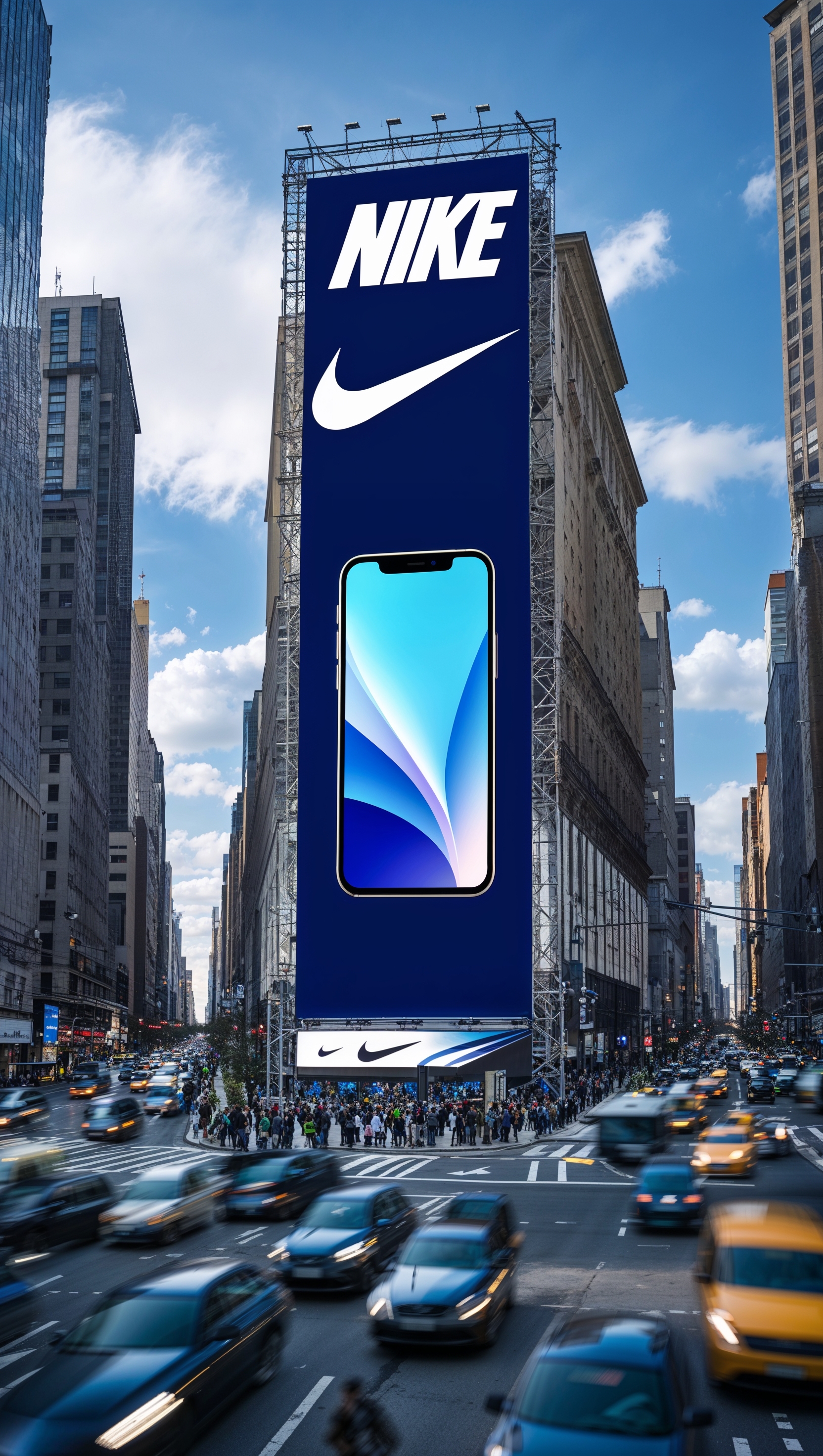 Create a 4K image of a Nike billboard on a busy street for an iPhone 1664x2944 Create a 4K image of a Nike billboard on a busy street for an iPhone