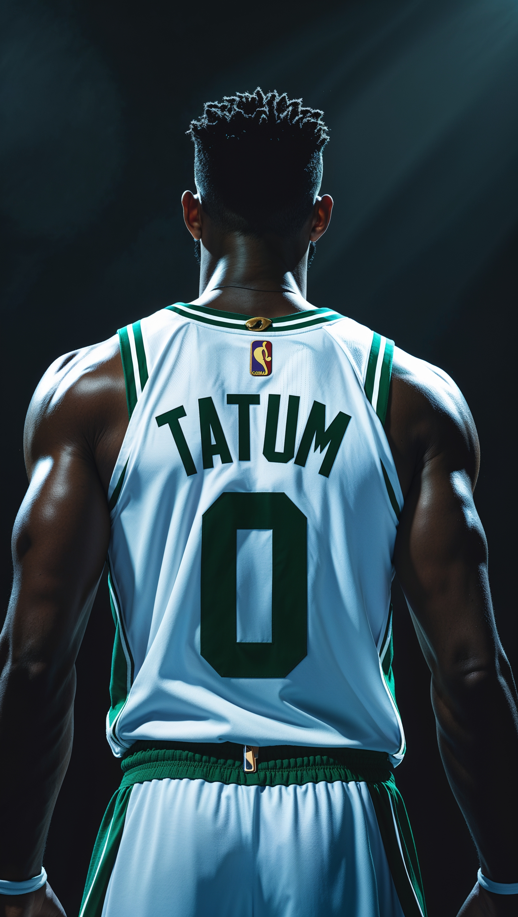 1664x2944 Back view of Jayson Tatum showing his jersey number, under spotlight on a dark court