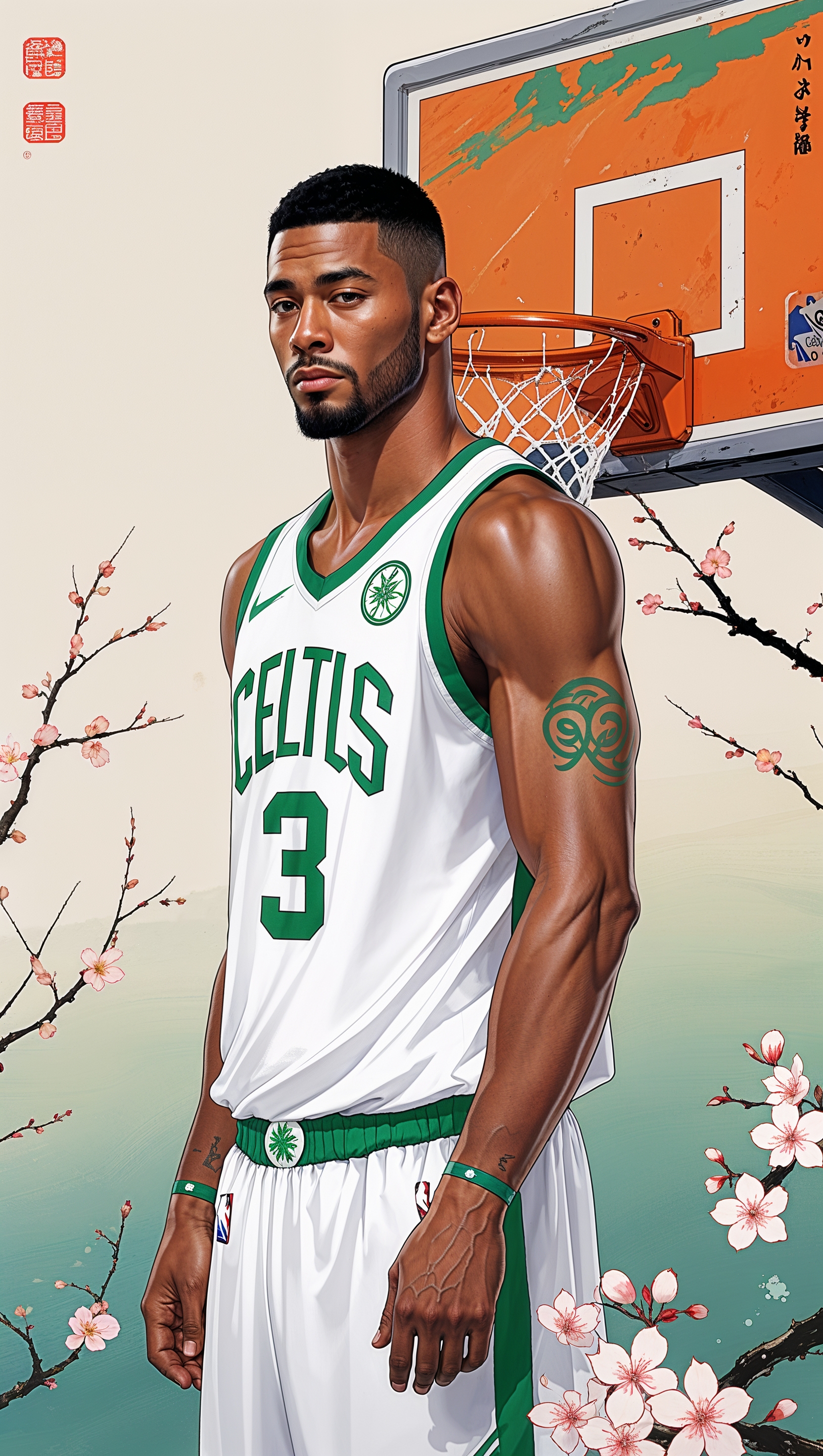 1664x2944 Traditional Japanese-style illustration of Jayson Tatum beside a basketball hoop