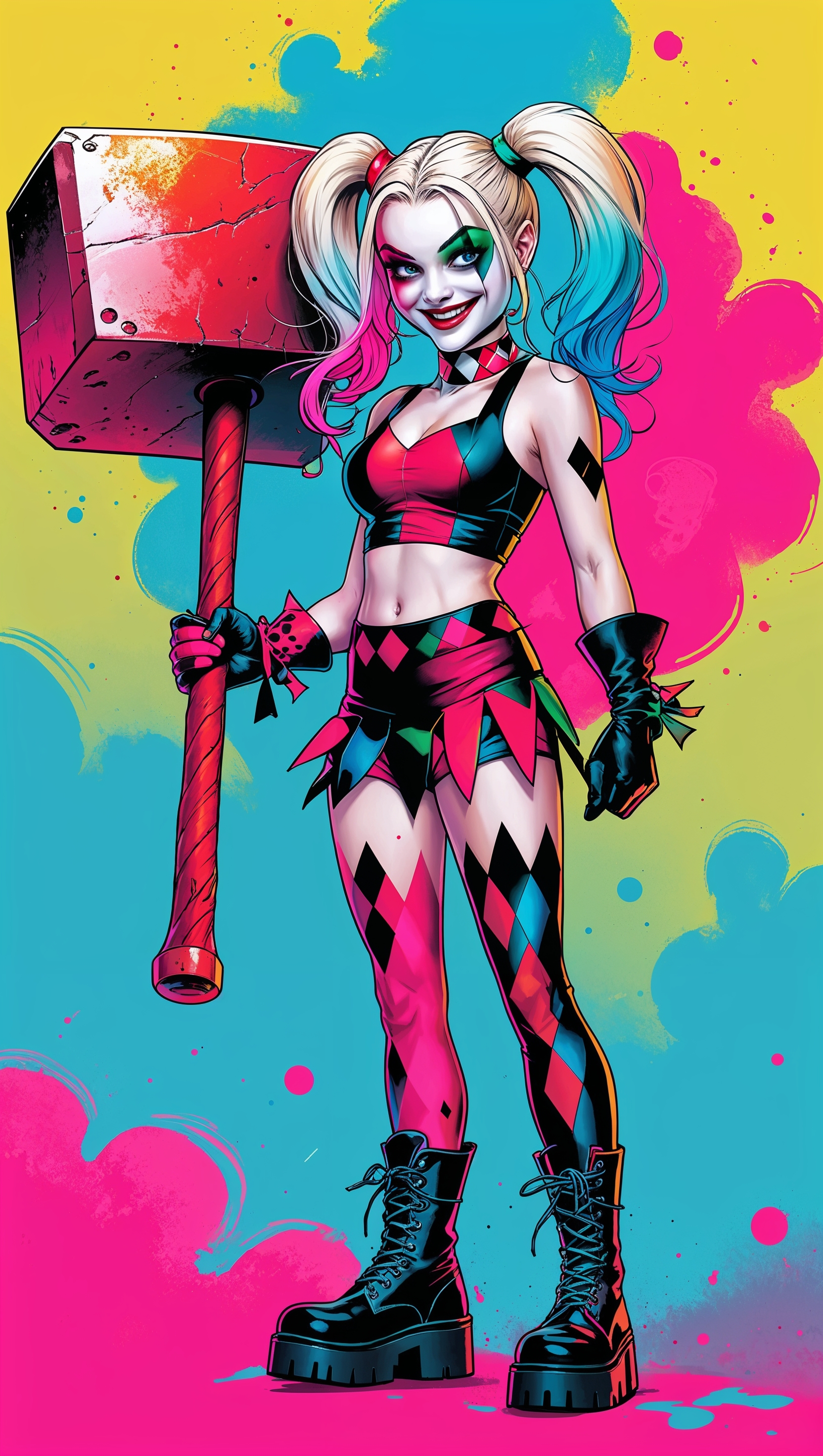 1664x2944 Harley Quinn with a giant hammer – colorful and fun iPhone wallpaper