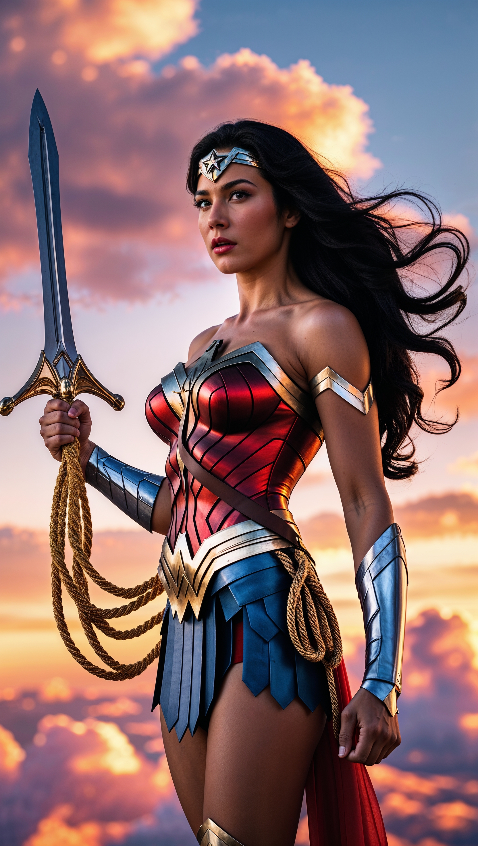 1664x2944 Wonder Woman with a sword at sunset – heroic iPhone wallpaper