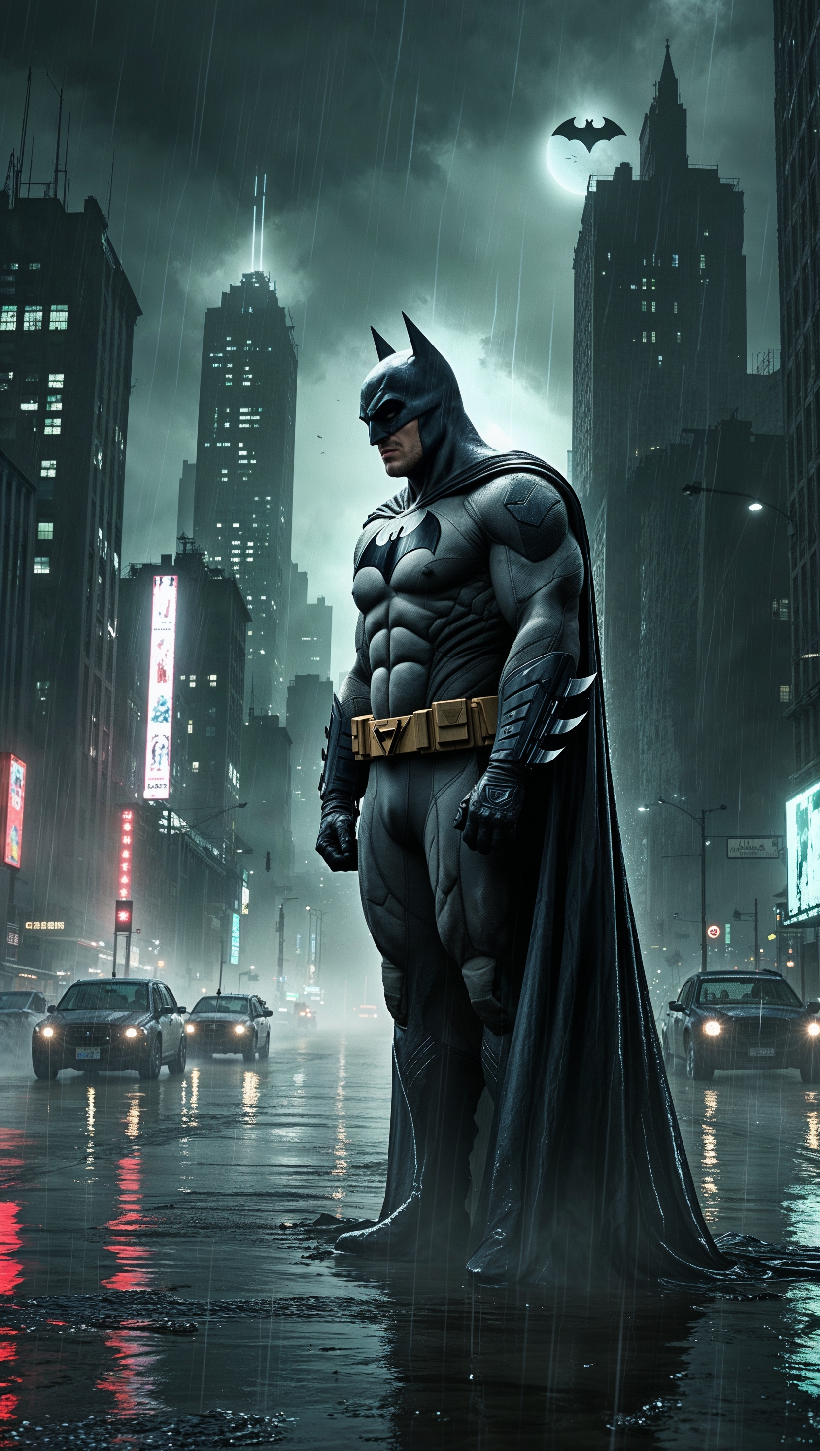 1664x2944 Batman in a rainy night with Gotham City in the background – iPhone wallpaper
