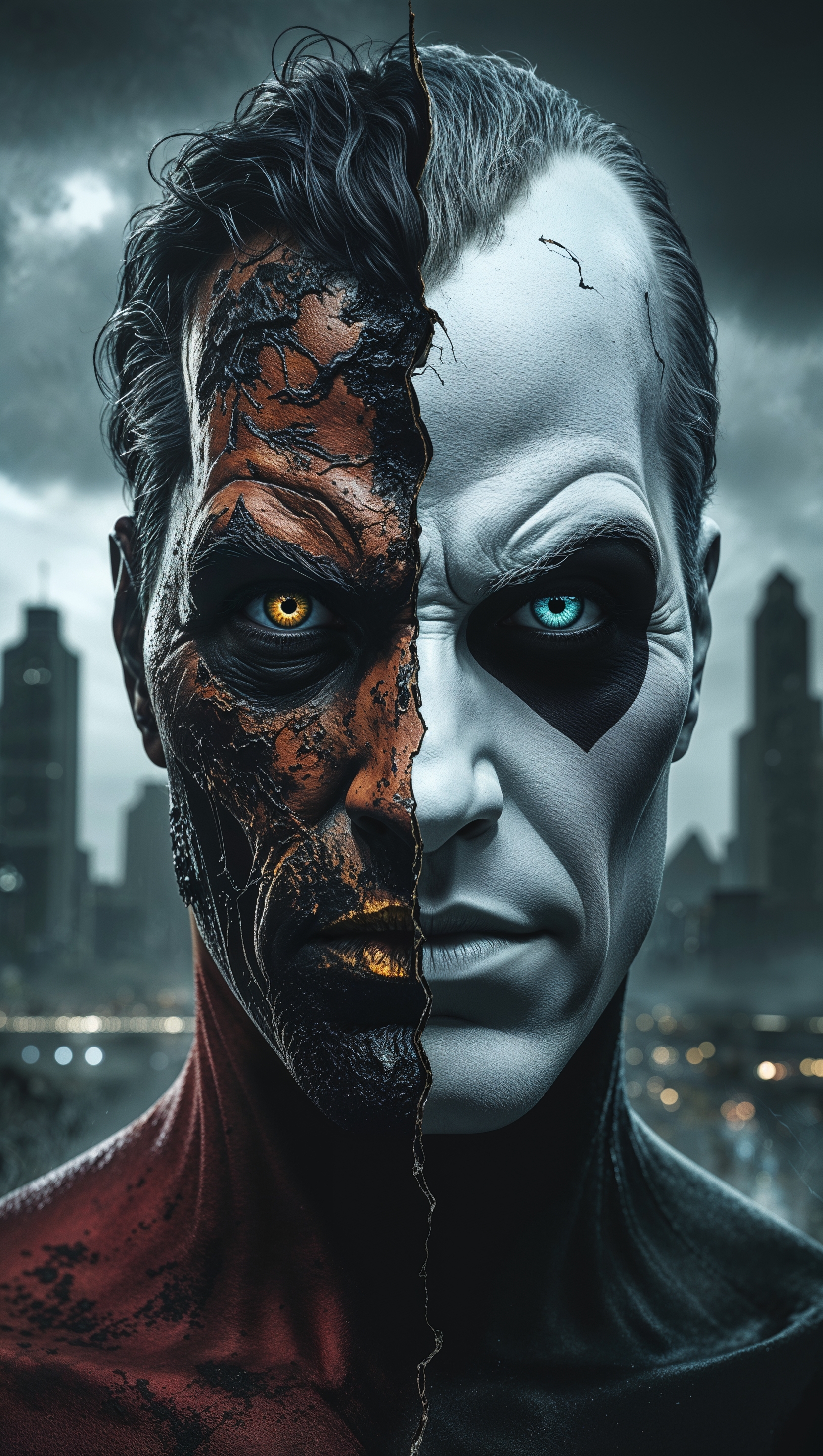 1664x2944 Two-Face with half-burned face – theme of good vs evil