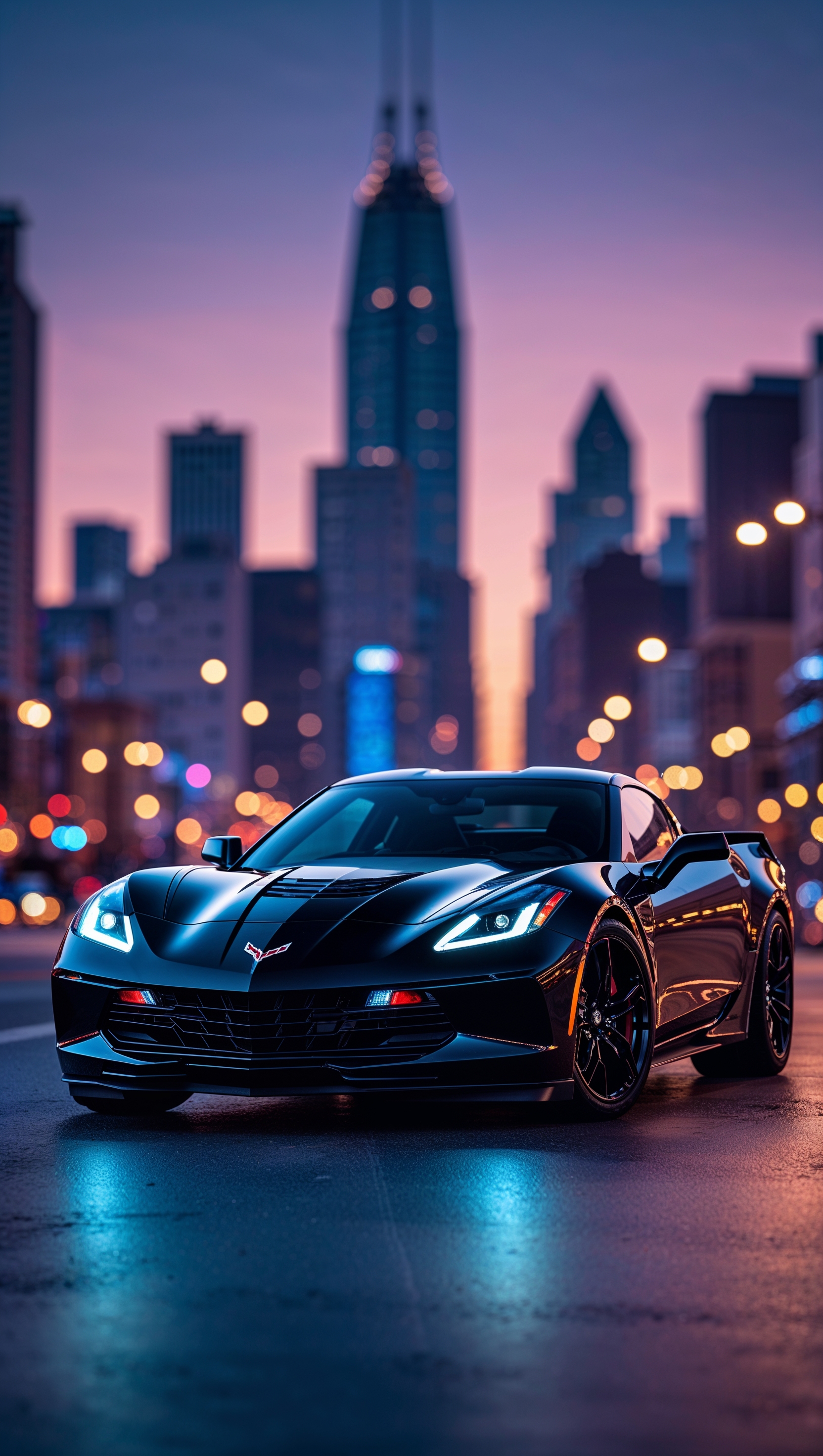 Black Chevy Corvette in front of a city skyline at dusk, moody atmosphere, iPhone wallpaper 1664x2944 Black Chevy Corvette in front of a city skyline at dusk, moody atmosphere, iPhone wallpaper