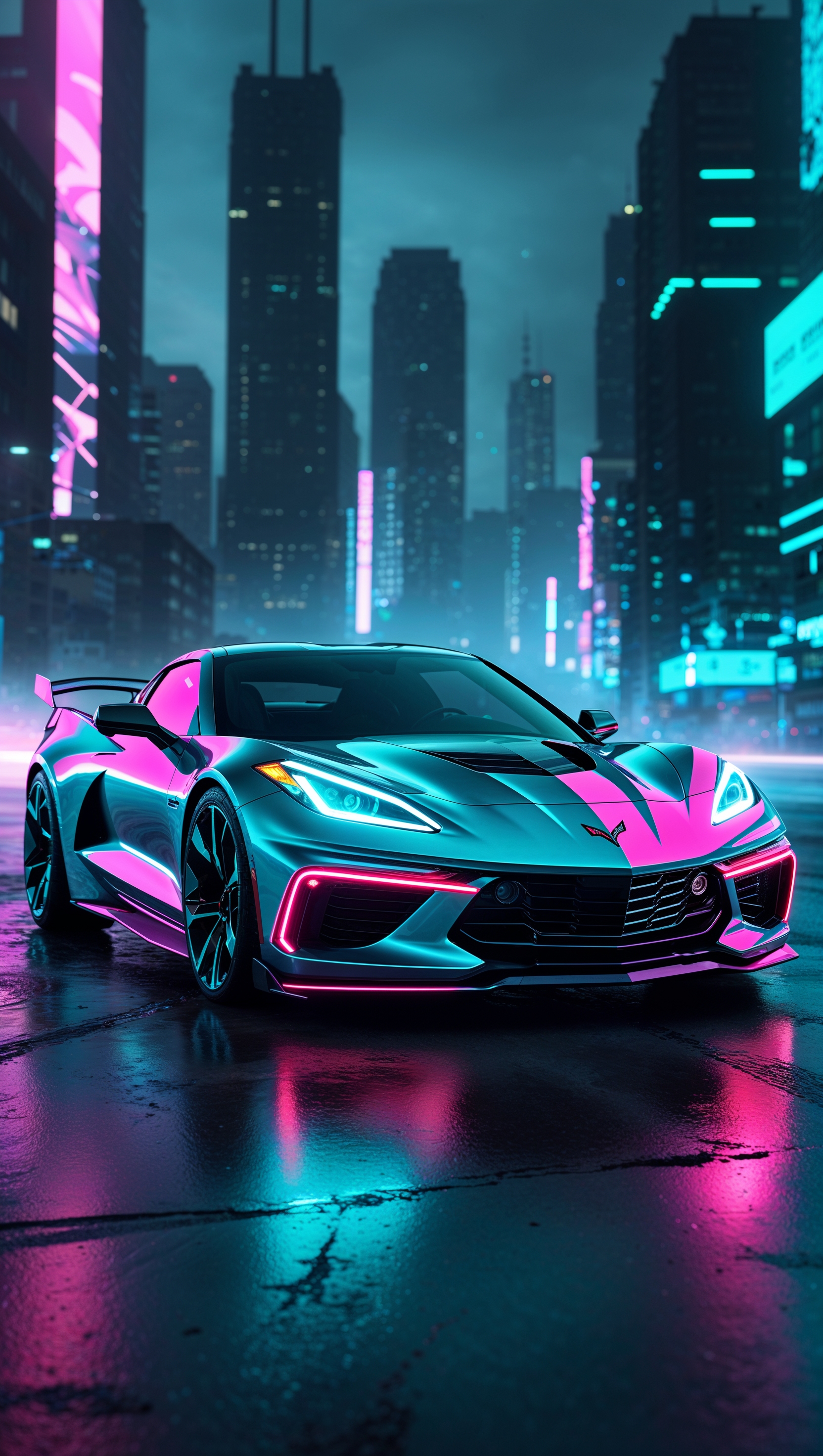 Futuristic Chevy Corvette glowing in neon lights at night, cyberpunk style, iPhone wallpaper 1664x2944 Futuristic Chevy Corvette glowing in neon lights at night, cyberpunk style, iPhone wallpaper
