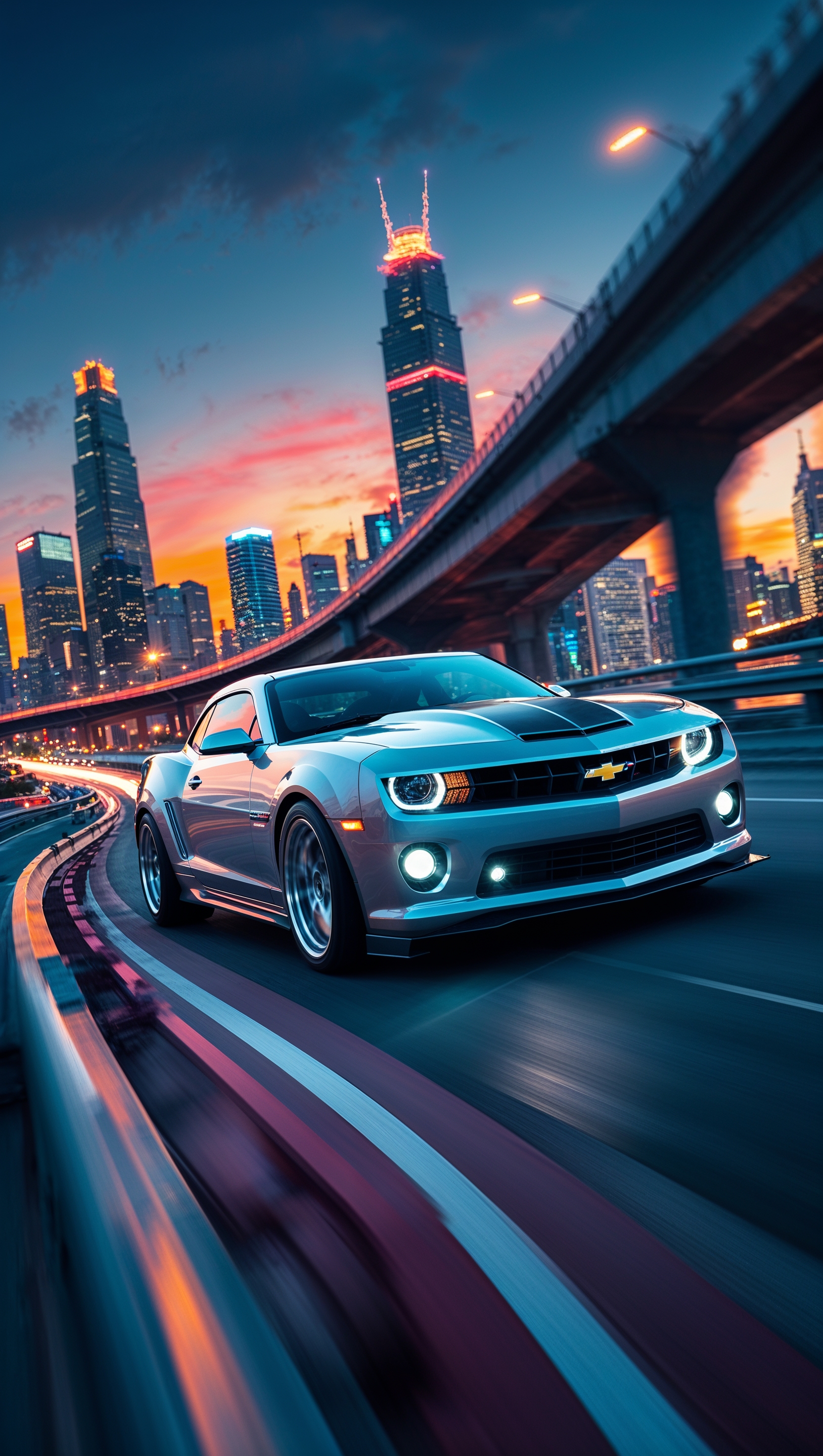 Chevy Camaro speeding on a bridge with city lights in the background, dynamic shot, iPhone wallpaper 1664x2944 Chevy Camaro speeding on a bridge with city lights in the background, dynamic shot, iPhone wallpaper