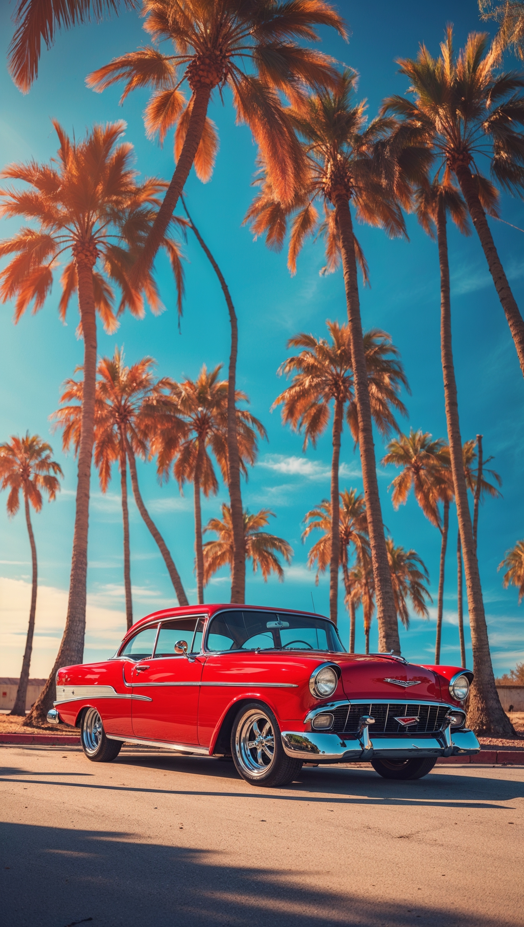 Chevy Bel Air from the 1950s parked under palm trees, retro filter, iPhone wallpaper 1664x2944 Chevy Bel Air from the 1950s parked under palm trees, retro filter, iPhone wallpaper