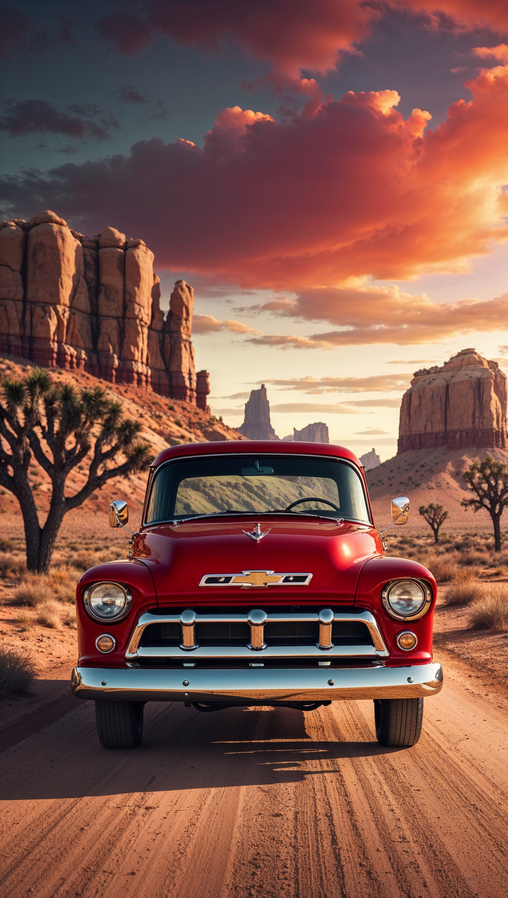 A red Chevy truck driving through the desert, cinematic lighting, iPhone wallpaper 1664x2944 A red Chevy truck driving through the desert, cinematic lighting, iPhone wallpaper