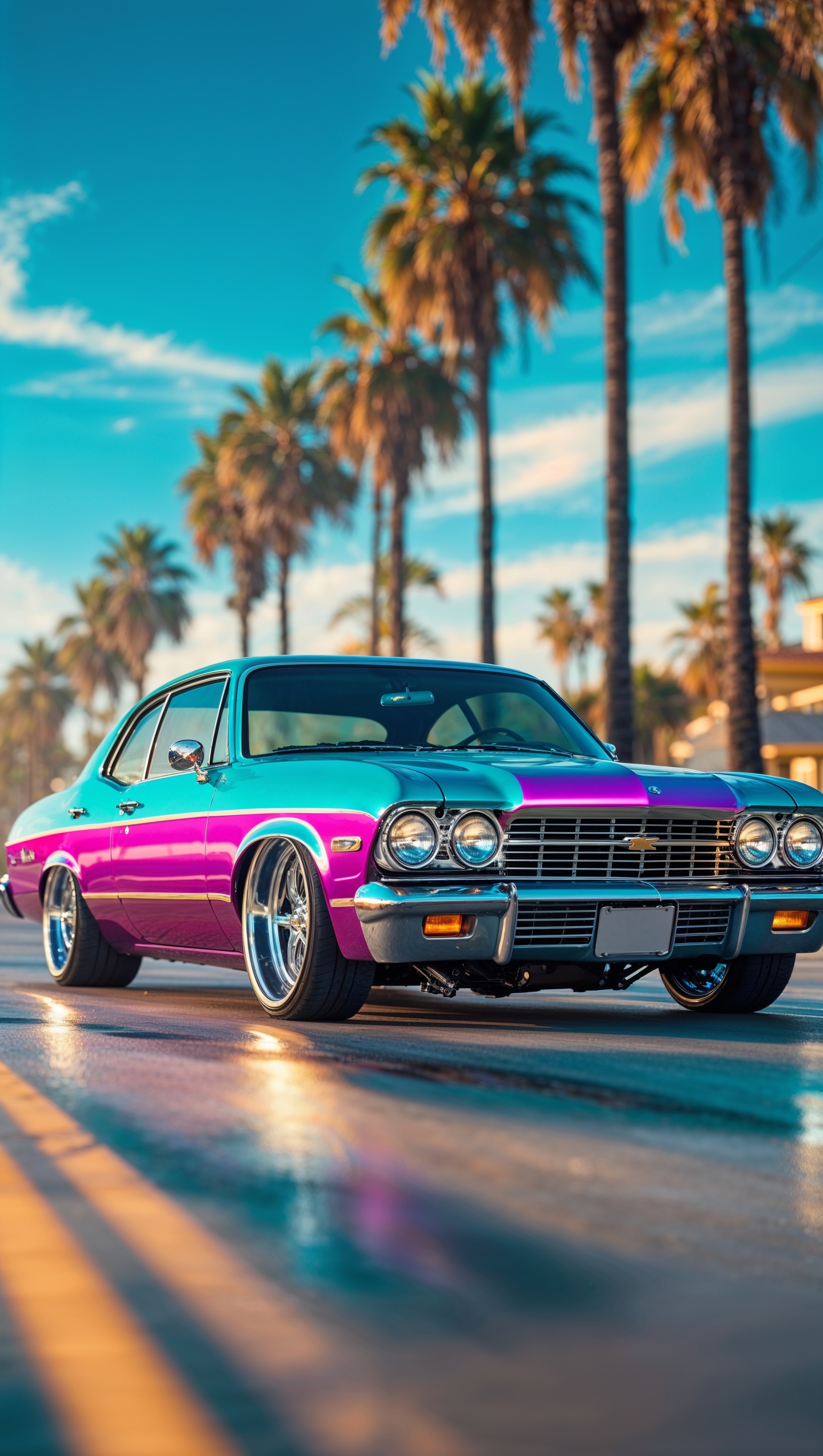 A lowrider Chevy bouncing in a sunny California street, colorful and vibrant, iPhone wallpaper 1664x2944 A lowrider Chevy bouncing in a sunny California street, colorful and vibrant, iPhone wallpaper